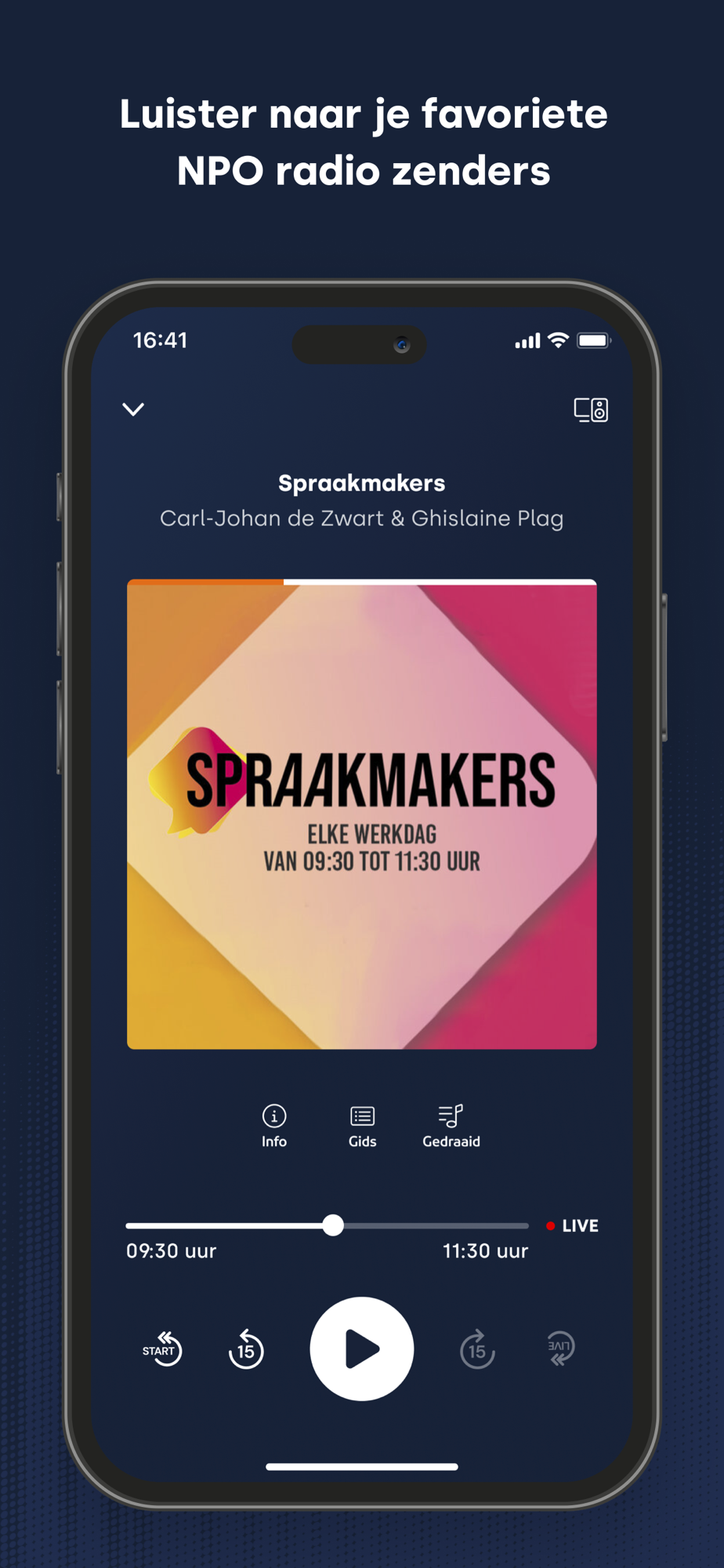 Het is ook mogelijk om naar jouw favoriete radiozender te luisteren binnen NPO Luister. Ga hiervoor naar Live radio op de home en kies een van de radiozenders van de NPO. Zo heb je niet alleen alle podcasts bij de hand, maar geniet je ook van NPO Radio 1, NPO Radio 2, NPO 3FM, NPO Radio 4, NPO Radio 5, FunX, NPO Blend, Soul & Jazz & KX