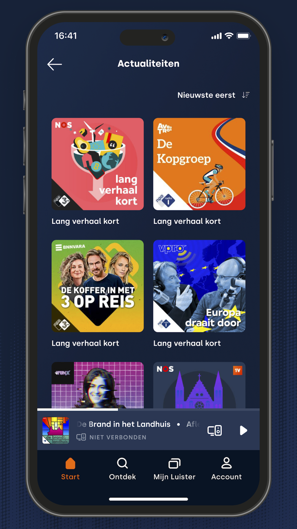 NPO Luister is de gratis podcast-app met al het aanbod van de Nederlandse Publieke Omroep. Luister naar podcasts, download ze voor een later moment of volg een podcast serie zodat je nooit een aflevering mist. Je vindt jouw favoriete podcasts en downloads op een overzichtelijke centrale plek in de app.Ben je op zoek naar een specifieke podcast? Zoek dan op omschrijving of titel van de podcast serie of raak geïnspireerd door een van de podcast series binnen onze categorieën.