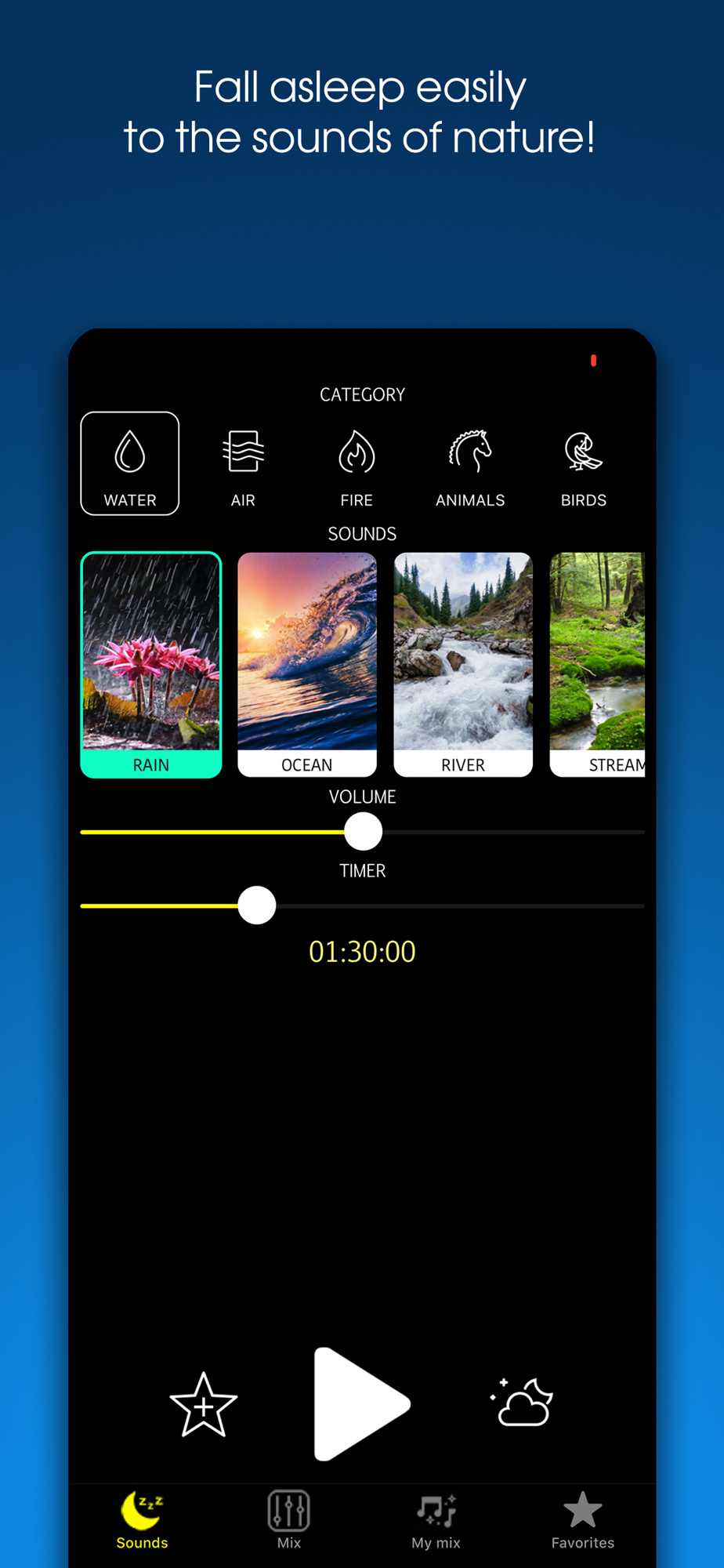 In our app, you can choose from a variety of sounds. For example, you can fall asleep to the sound of incoming ocean waves or the sound of rain, wind, or the rustle of leaves in the forest.