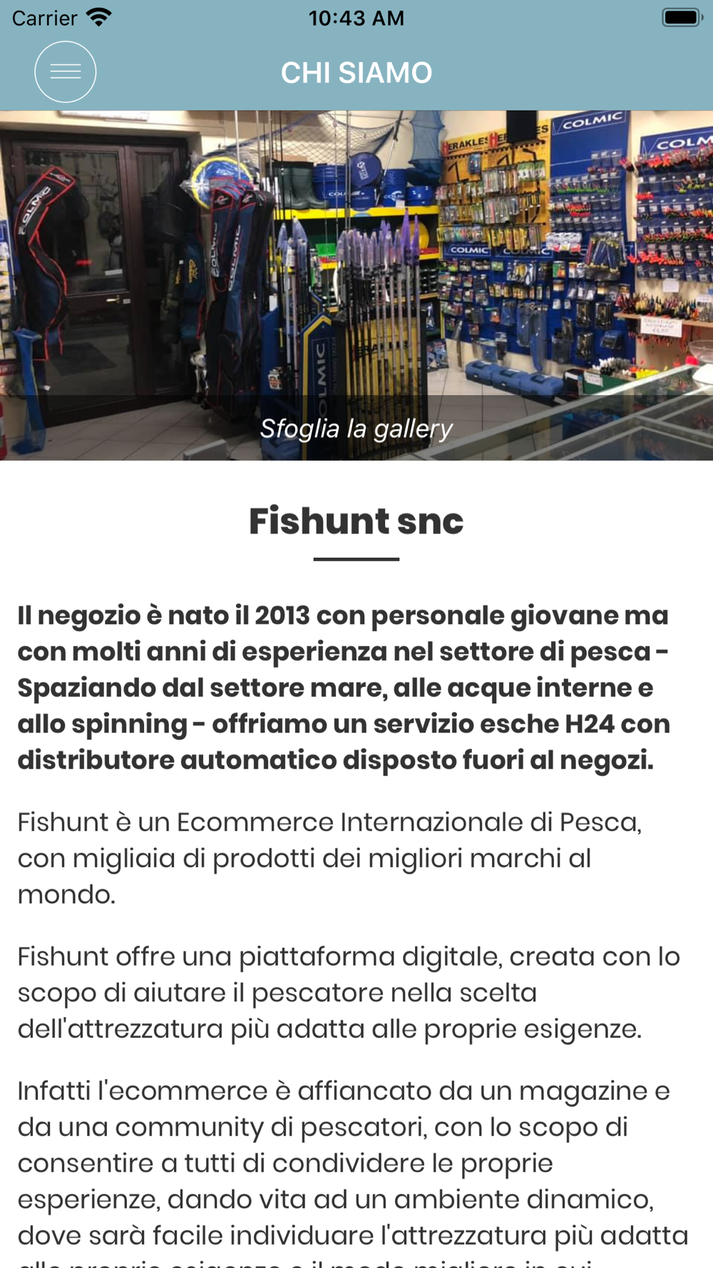 Il negozio è nato il 2013 con personale giovane ma con molti anni di esperienza nel settore di pesca - Spaziando dal settore mare, alle acque interne e allo spinning - offriamo un servizio esche H24 con distributore automatico disposto fuori al negozi.