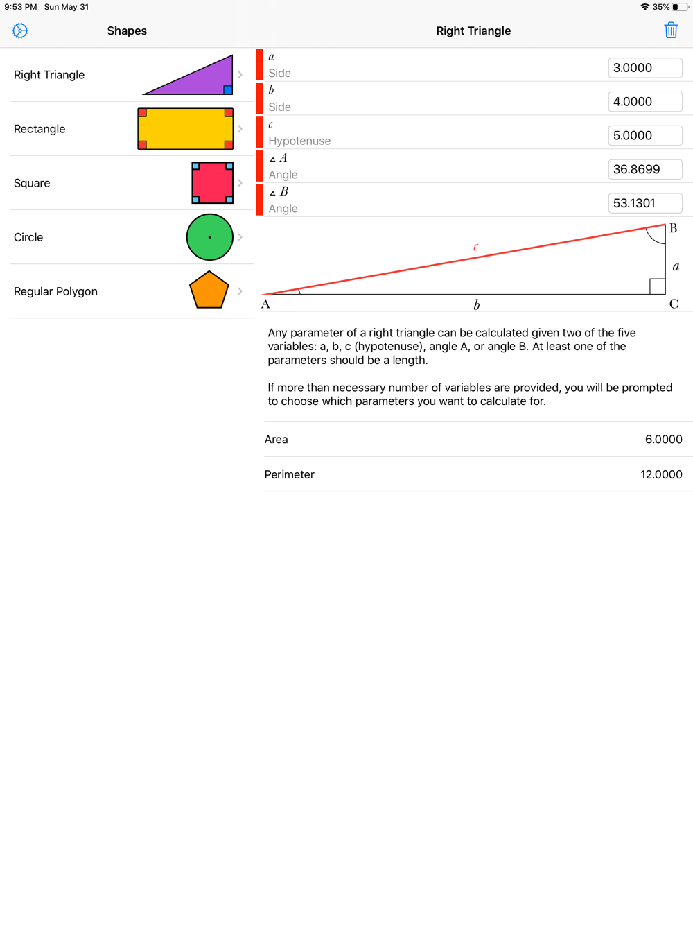 Geometry Calculator++ is a universal app that runs on your iPhone and iPad with a single purchase. It helps you solve for the parameters of geometrics shapes. It draws them as well.