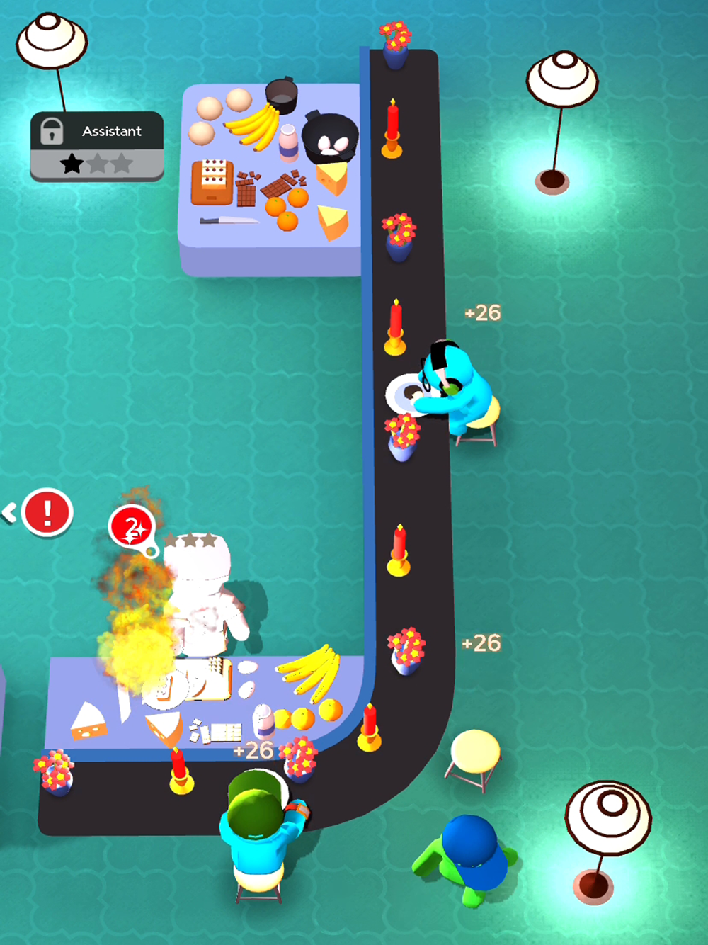 The assistant will help the chef. You can upgrade them at any time to unlock new meals or to get them more skills. The cooking and baking is a really nice event for the guests. When you upgrade the assistant, he will also show some of his great dance moves.