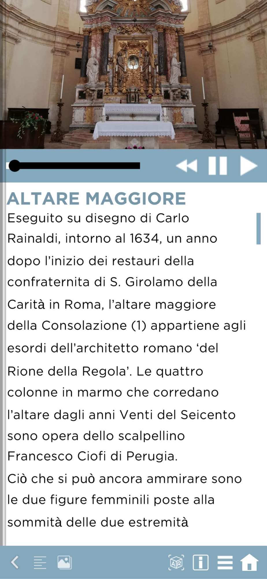 La Consolazione di Todi è una applicazione che sfrutta le funzioni dell’Augmented Reality e del Bluetooth per dare al turista una esperienza unica e coinvolgente di visita del patrimonio artistico rinascimentale del Tempio di Santa Maria della Consolazione di Todi.