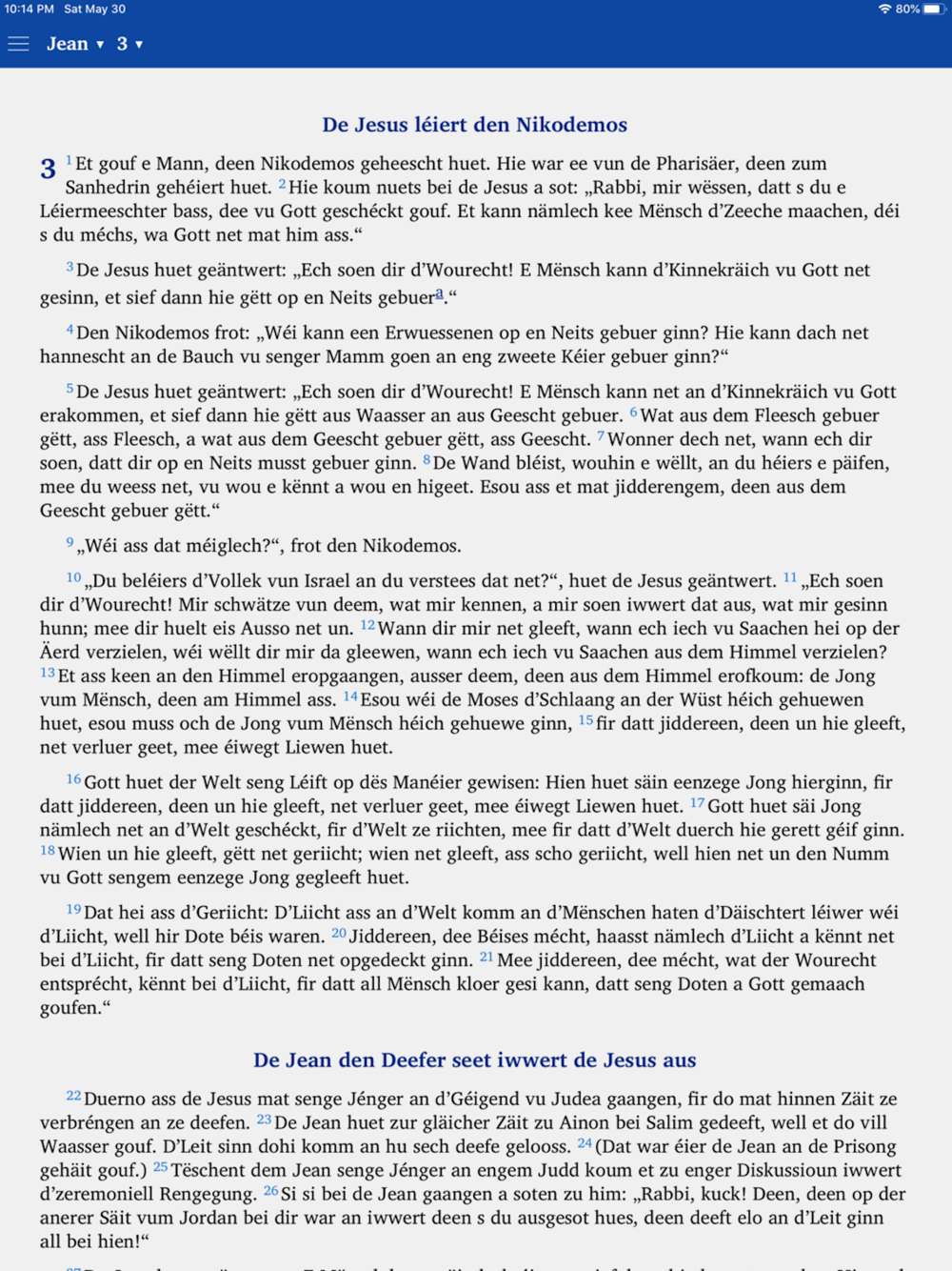 This app provides a translation of the New Testament Bible into the Luxembourgish language. It is produced by Bibles International, the Bible Society, Translation and Publishing Department of Baptist Mid-Missions