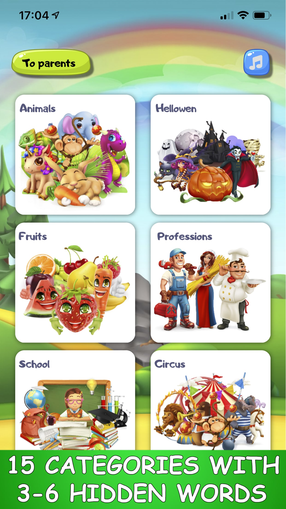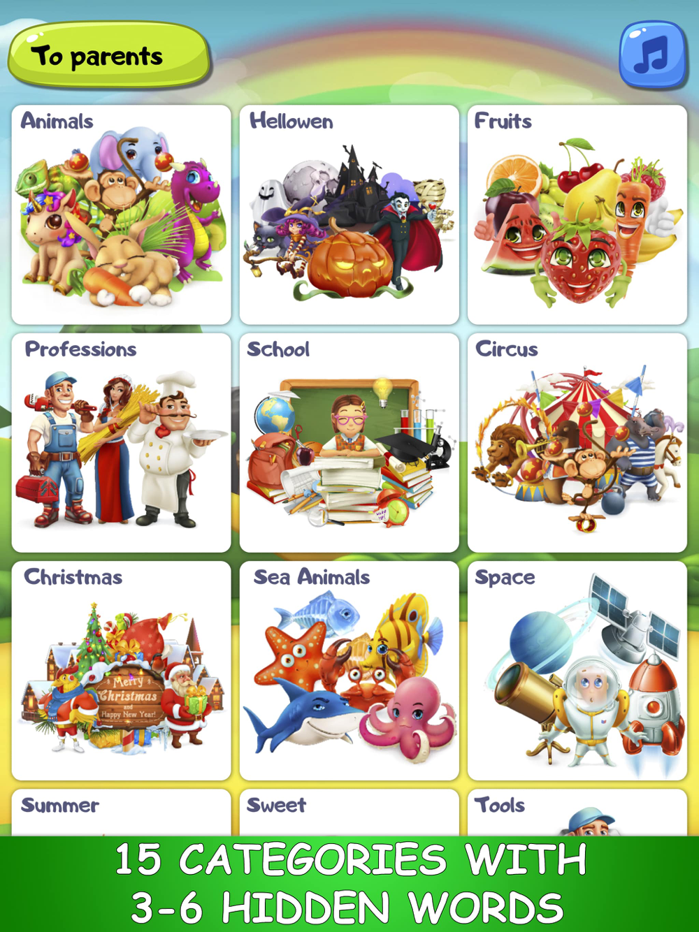 => 15 categories each containing 30-60 hidden words on various topics: home, family, animals, food, games. Search word by word with your kid, enrich their vocabulary and broaden their outlook.