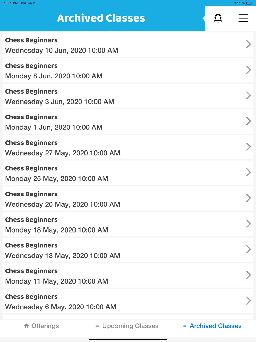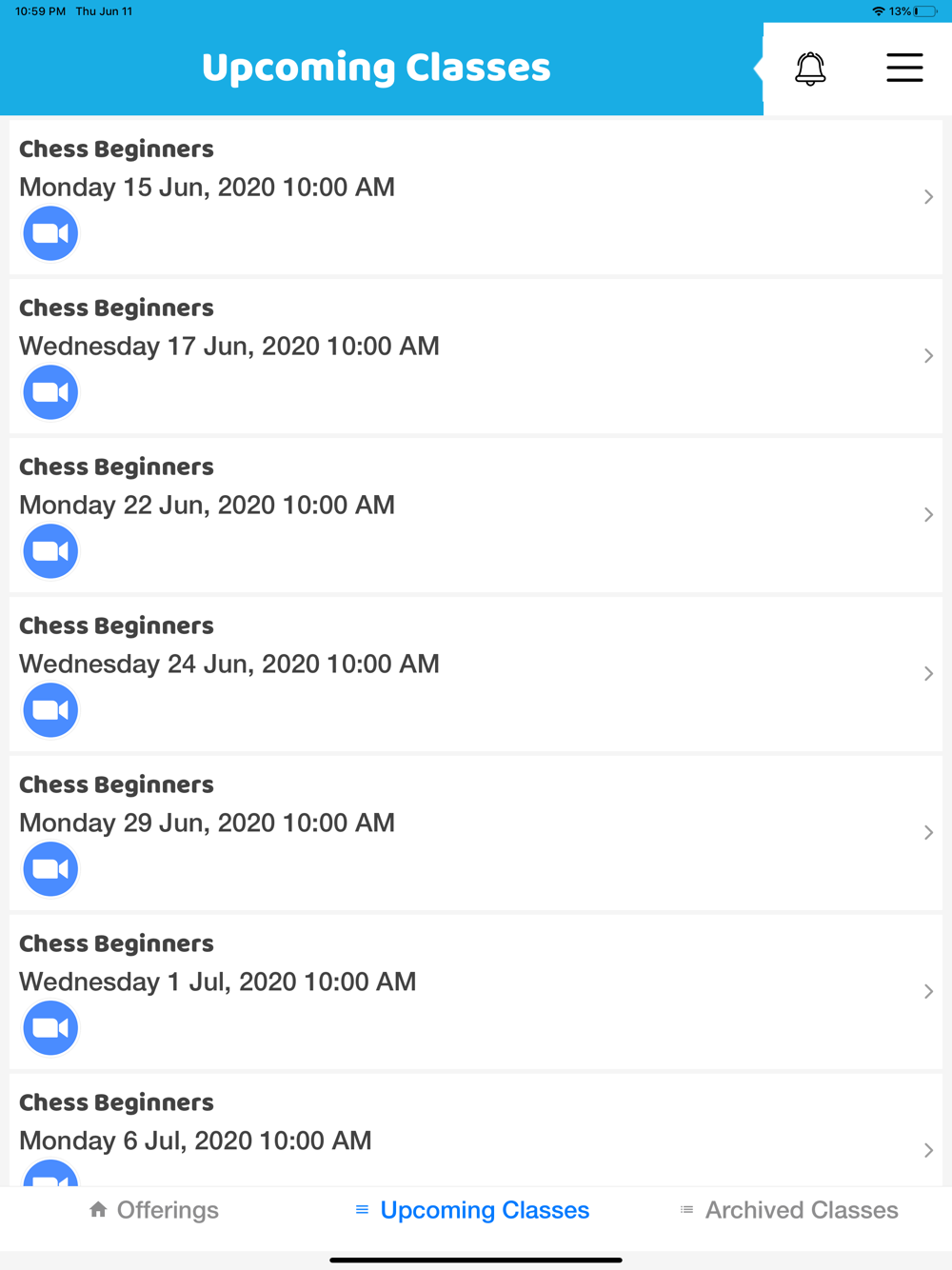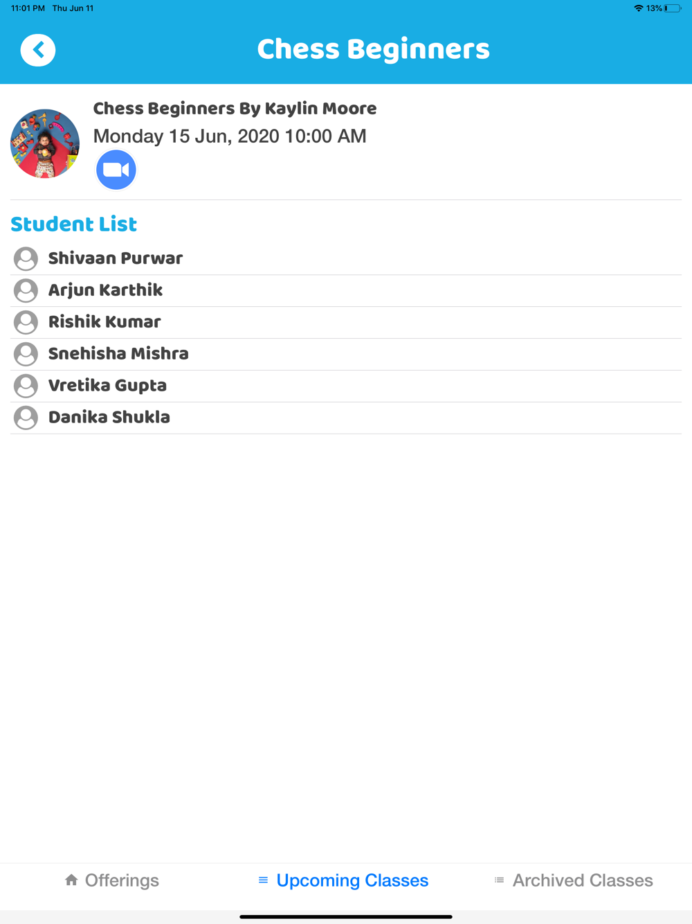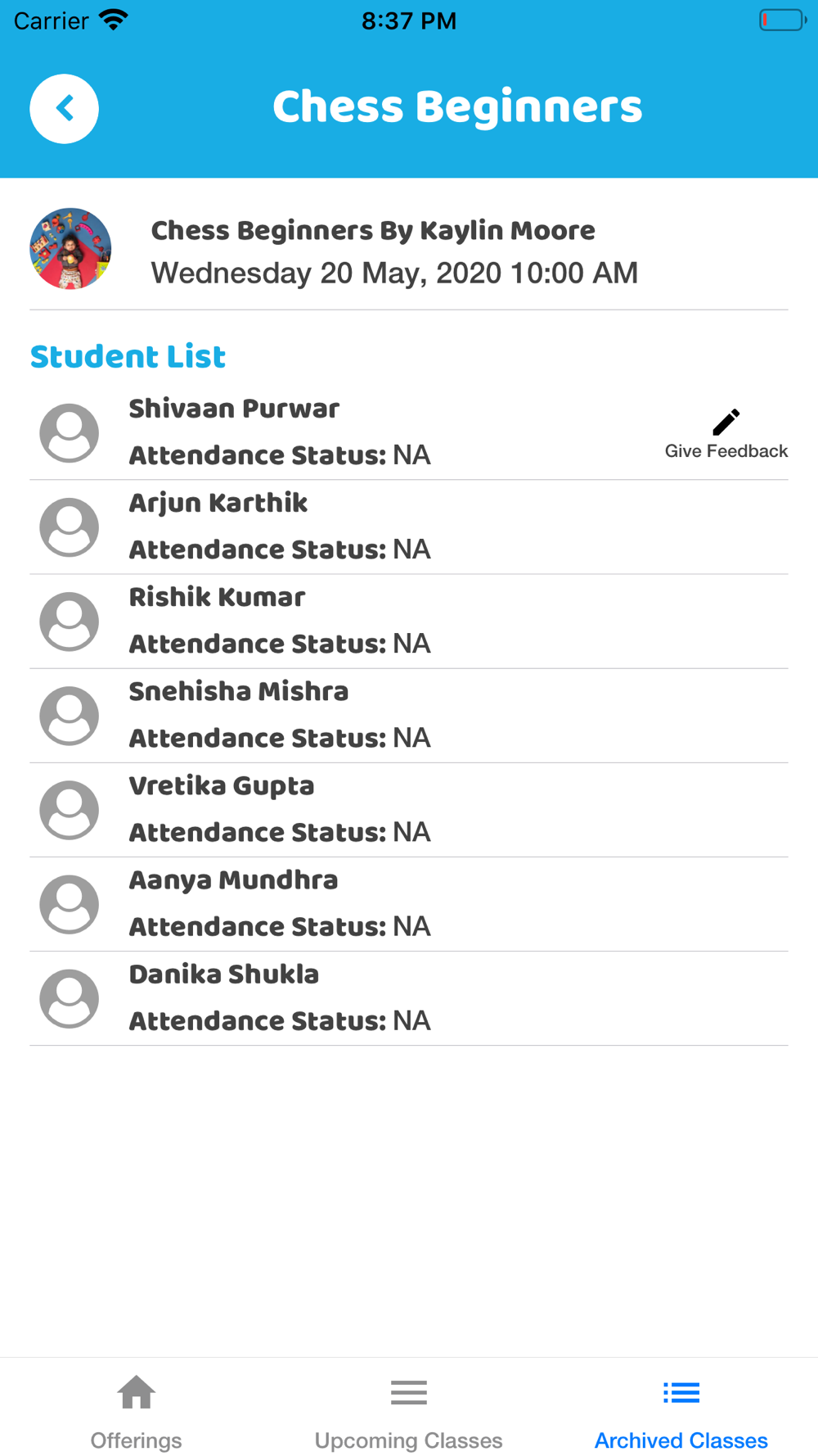 Users will be able to check upcoming classes as well archive of past classes, along with any other information associated with classes, e.g. Zoom Link, Notes, attendance, rating & Feedback etc