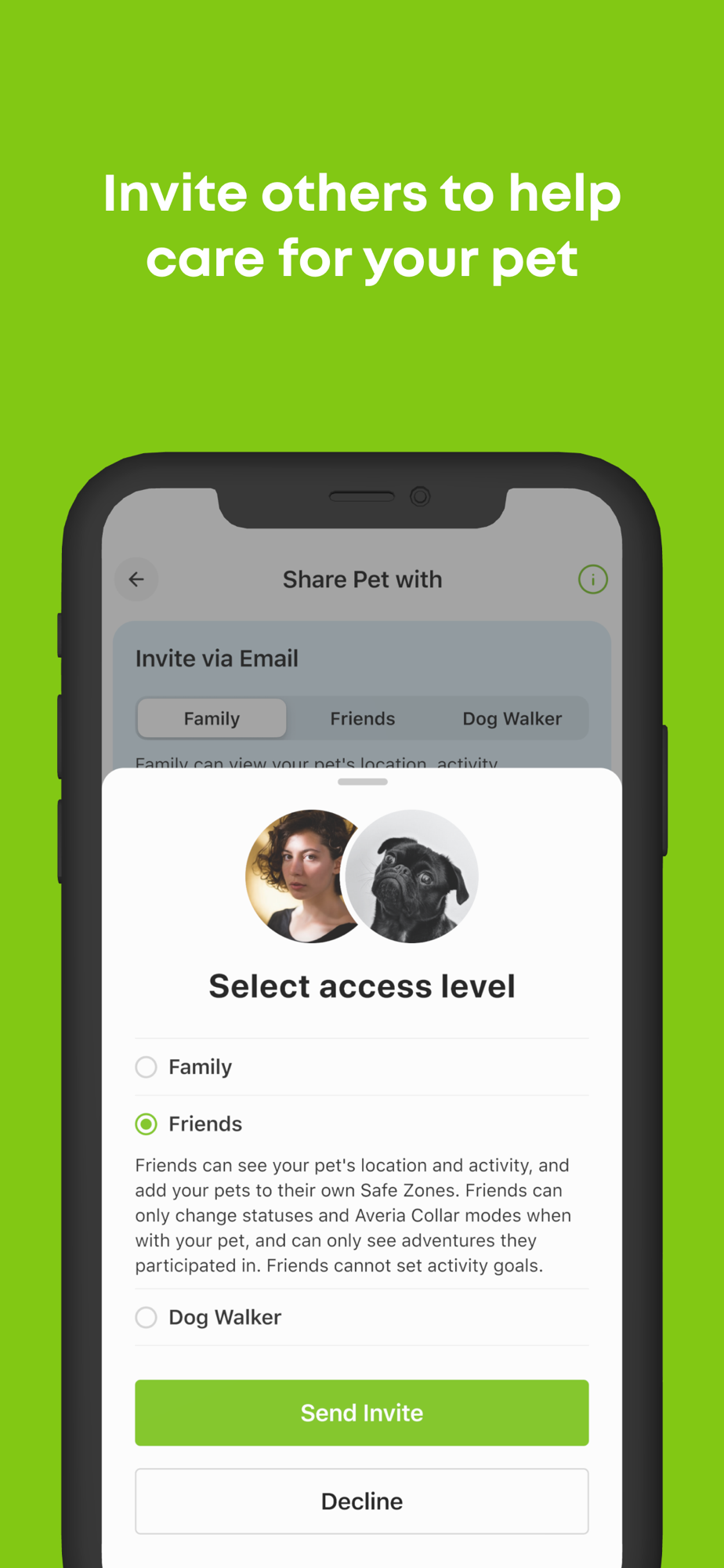 Share your pet(s) with friends, family, or the dog walker so you always know who they’re with and what they’re up to.