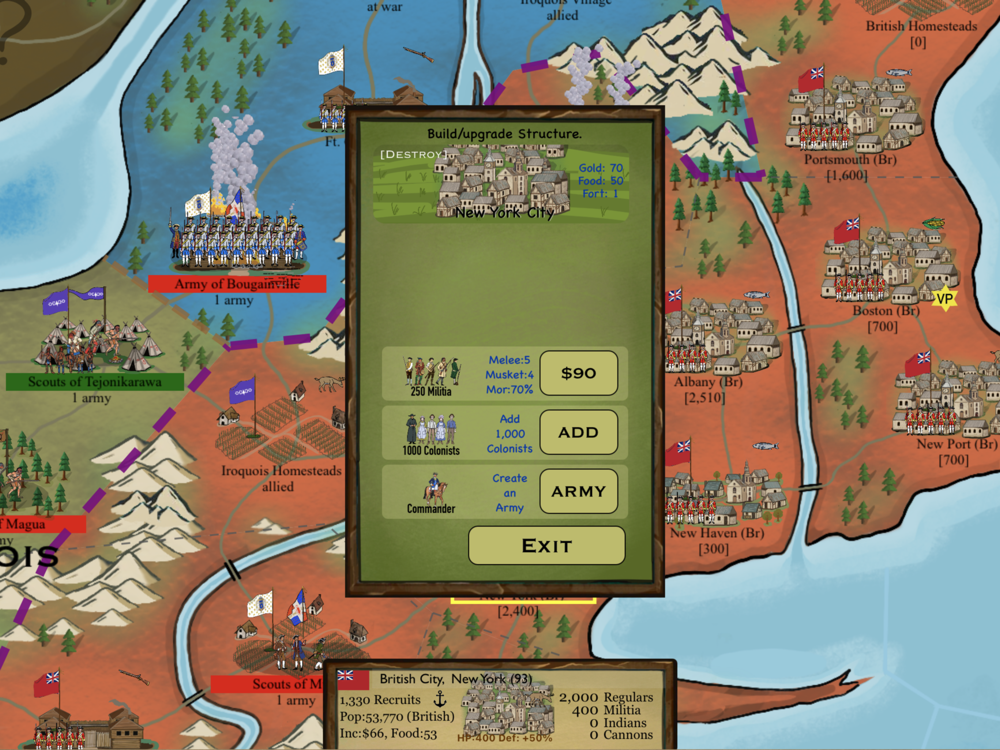 War in America (The French and Indian War) is a war game set in the 17th and 18th century's during the discovery period. It is a turn-based conquest game pitting 4 European nations and 16 Indian nations in an epic struggle for control of the east coast of North America. Use your armies to explore, conquer and settle new lands. Develop and build towns and villages, gather resources and trade with your neighbours to make treaties and alliances. You can play as either the Indian or European nations, using any one of the many great commanders to lead your army to victory or defeat.