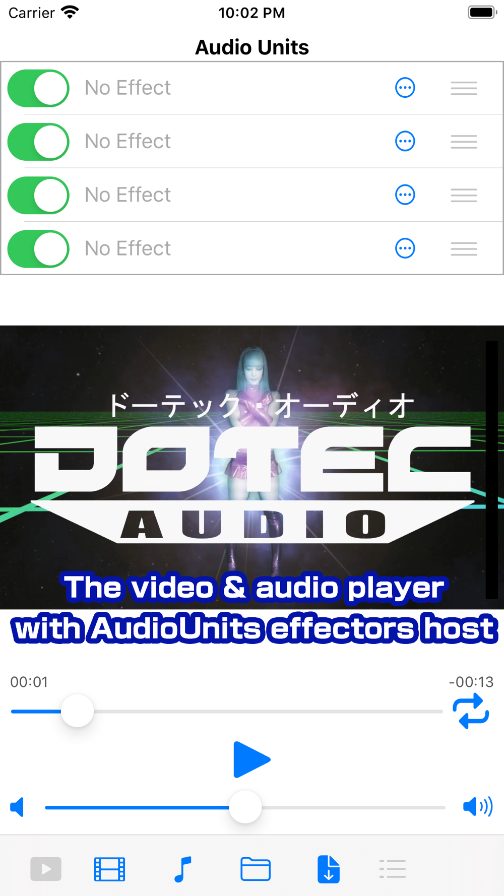 A simple free video & music player that allows you to play music files while playing effectors that support Audio Units Extension (AUv3 plugin) format.