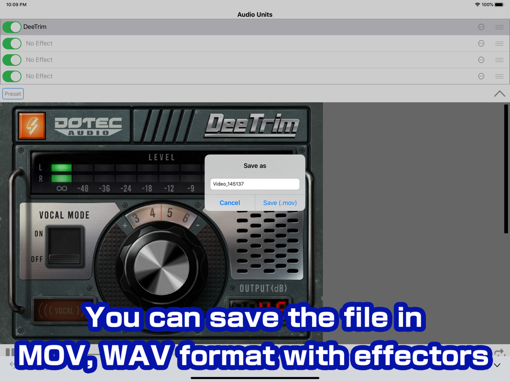 You can even save them as MOV or WAV files with effects applied, so you can load in sound sources from other apps or DJ mixes for professional mastering !