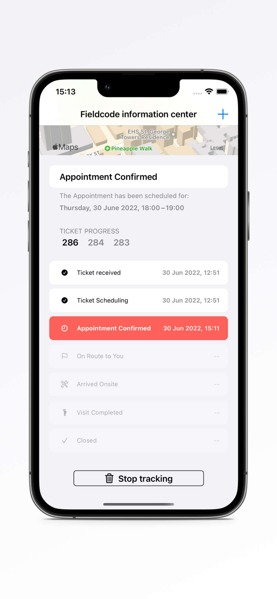 The Fieldcode information center app enables you to keep track of the service delivery progress. Within the app you can monitor the status of your event and access detailed information on its resolution progress. You can access the details of a specific event on the app in two ways: either by clicking on the token received via email or by filling in the token number on the dedicated field within the app.