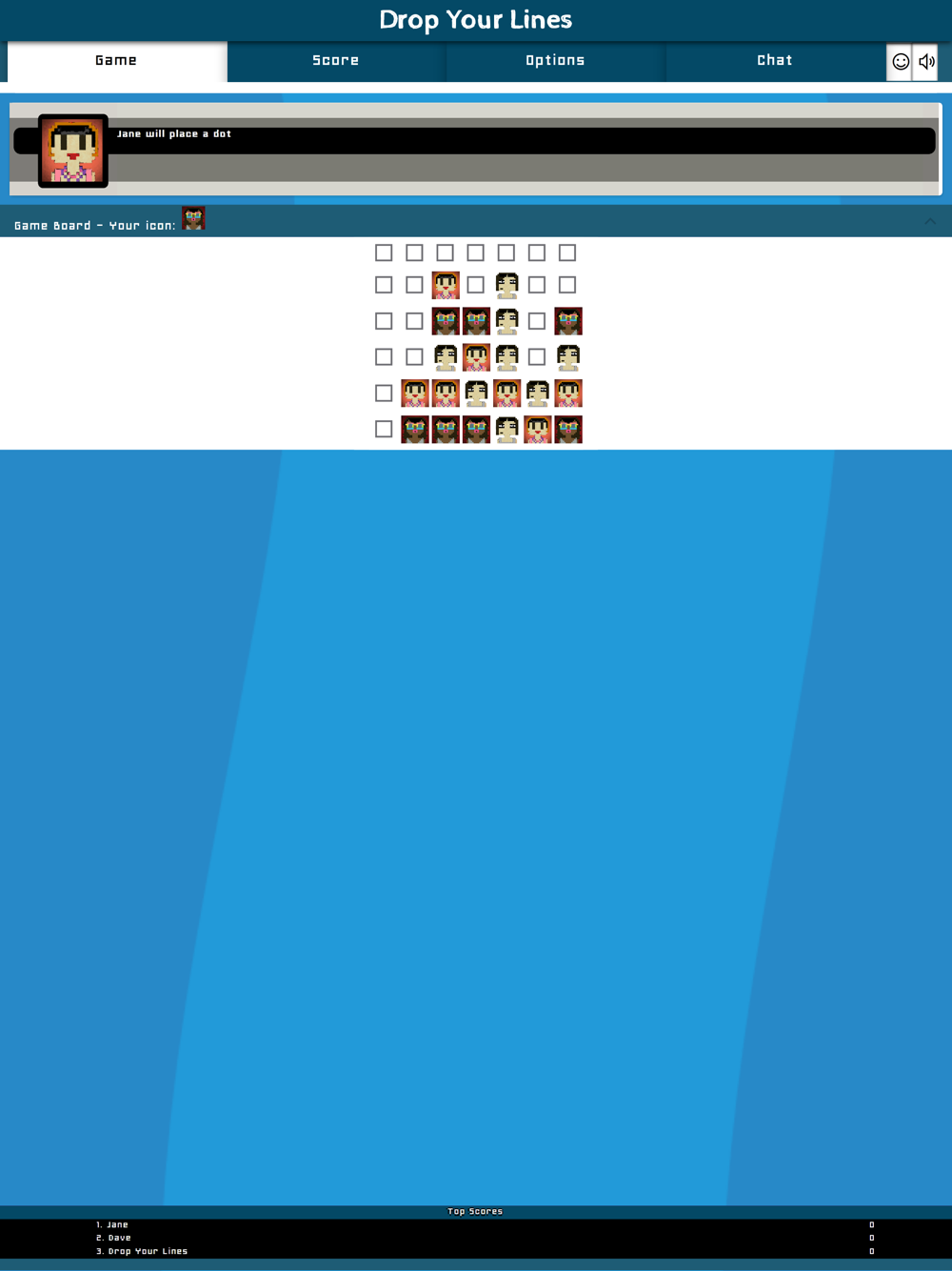The goal of the game is to form horizontal, vertical or diagonal lines by placing a dot on the board. Every dot you place will fall to the bottom of the board, and is placed on the first free cell it finds. When a dot is placed you can earn points if the length of all the dots in that line are equal or longer than 4. (This amount can be changed in the game options). The dots are removed from the board, and you may place another dot. All dots will fall down closing all the gaps that were created by the removal of the line. If you did not make a line, the other player can then place their dot.