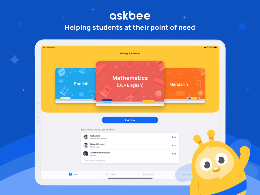 Get 1-on-1 homework help for the subject you need, right when you need it. No more being stuck on a question and having to wait till your weekly tuition class to get help with it. Just tap "Ask Now" on AskBee, and our friendly tutors will 'bee' ready to guide you!