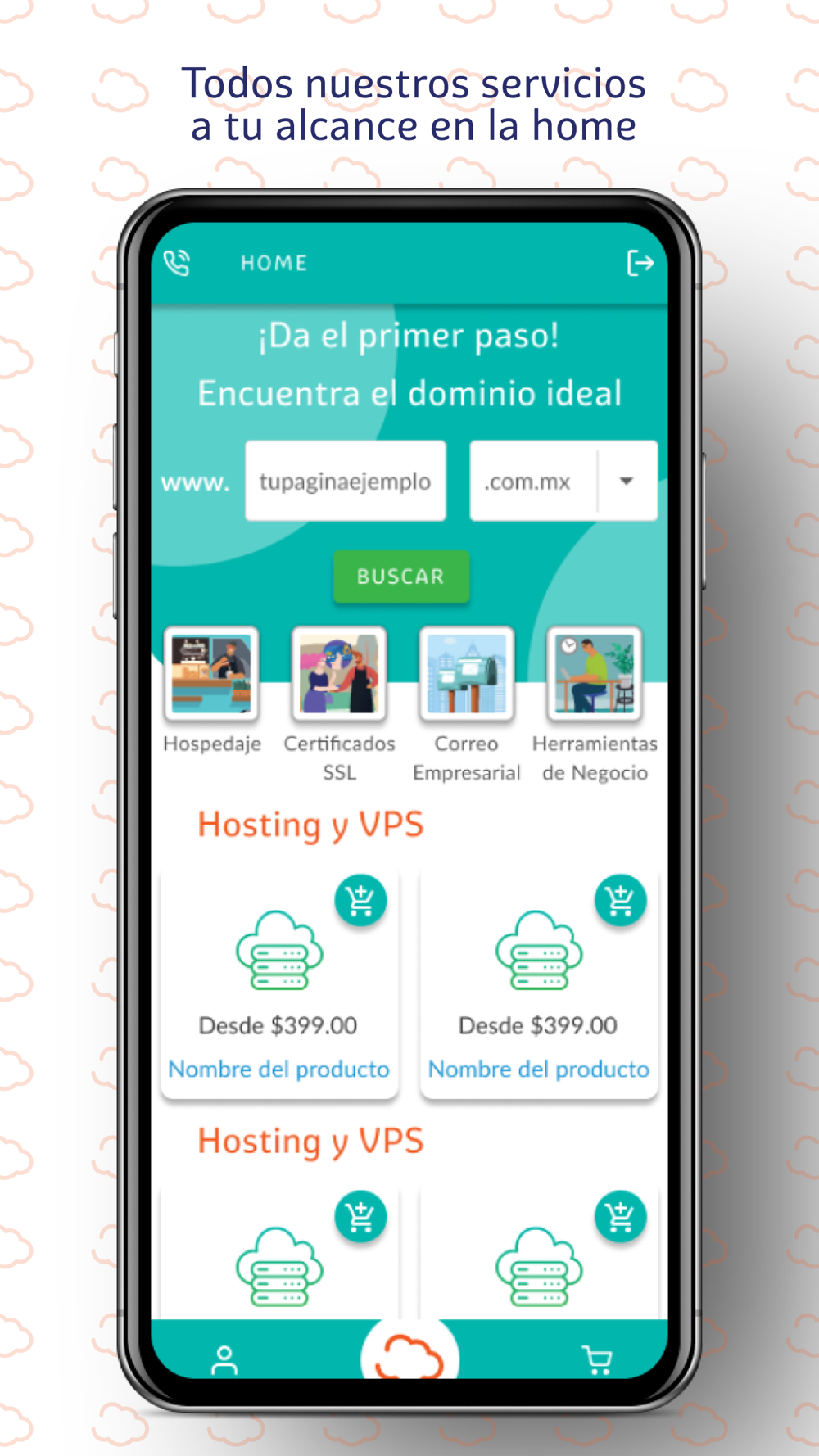 Comienza registrando tu dominio y elige la opción de hospedaje que más se adapte a las necesidades de tu negocio como Hospedaje Web, VPS o Creador de páginas web.