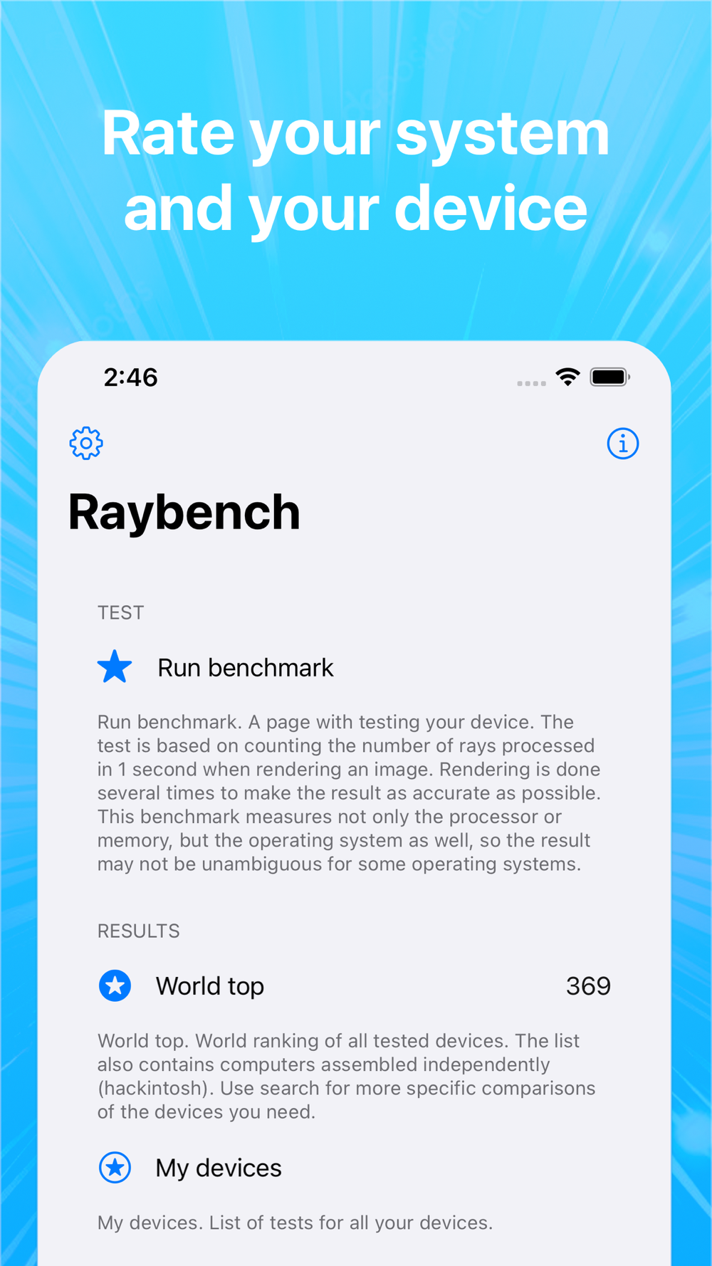 This test, unlike other synthetic tests, shows the performance of your device using a simple image rendering task as an example. The benchmark renders a picture and shows how many rays per second your device processes in a given operating system.