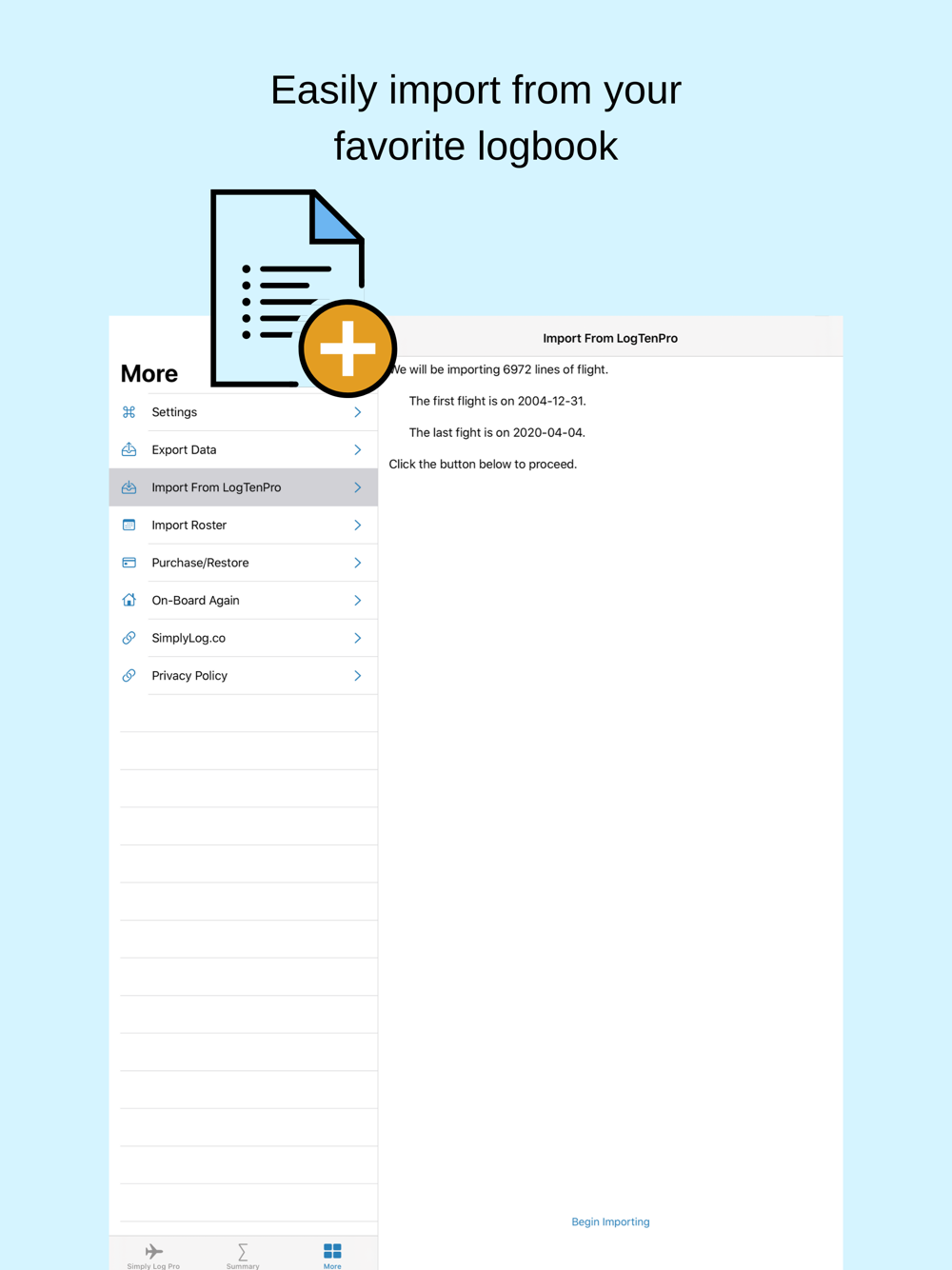 - Import logbook from LogTen Pro: If you are an existing user of LogTen Pro, we made it easy for you to migrate over to SimplyLog.