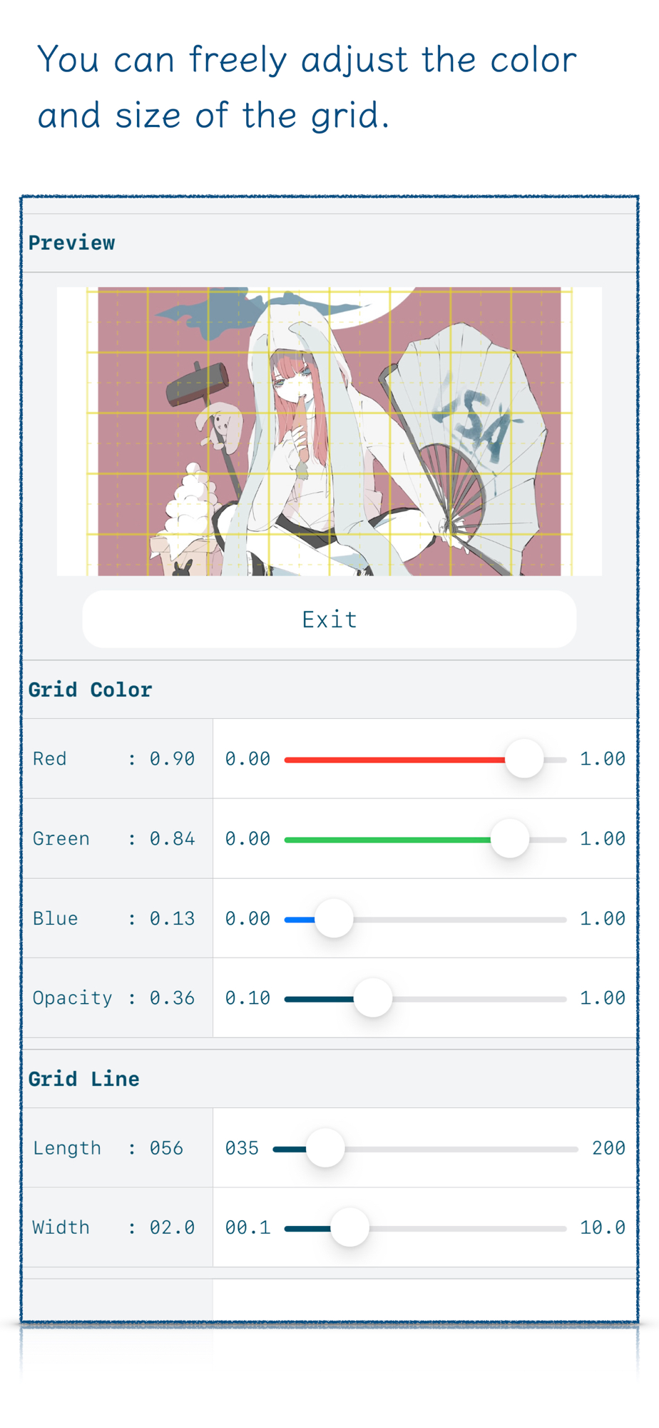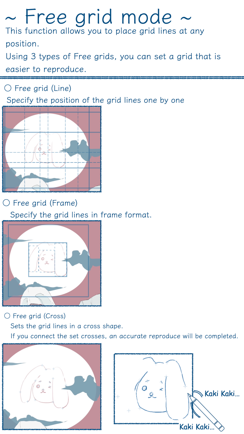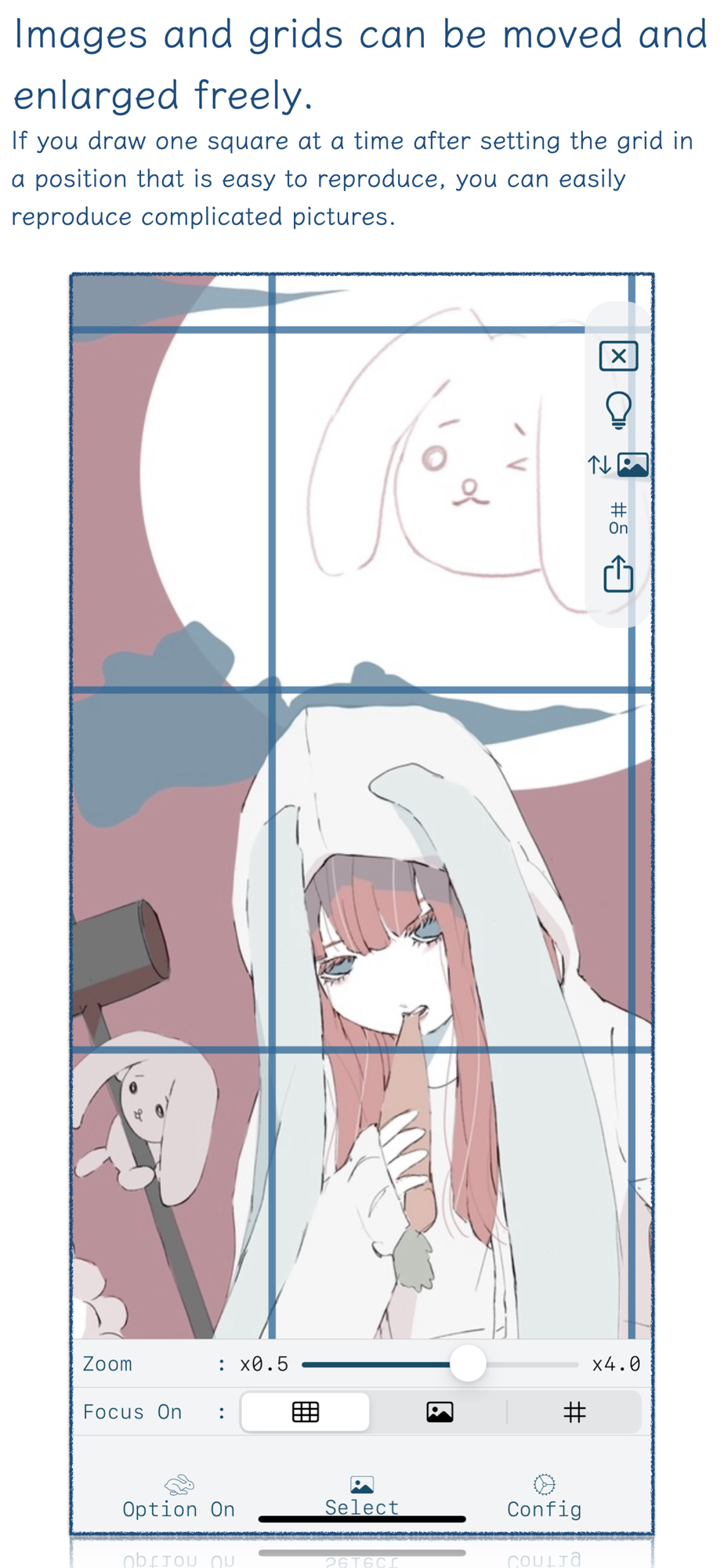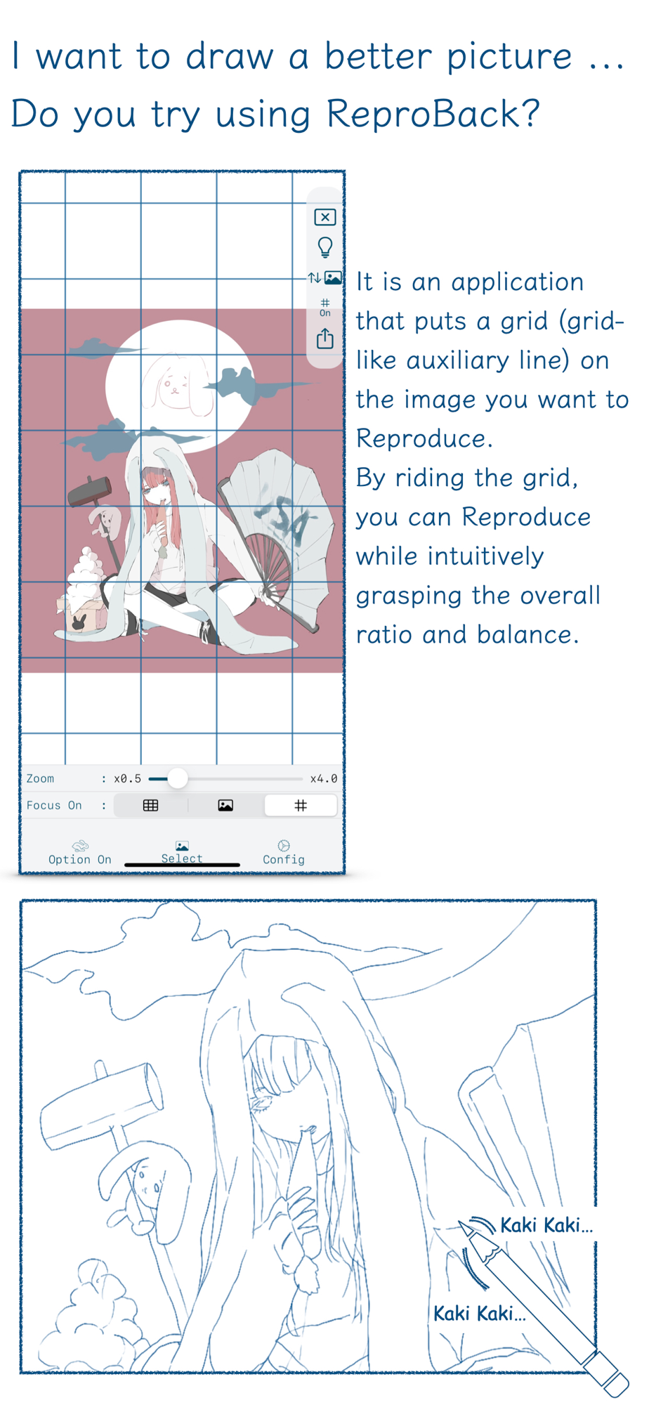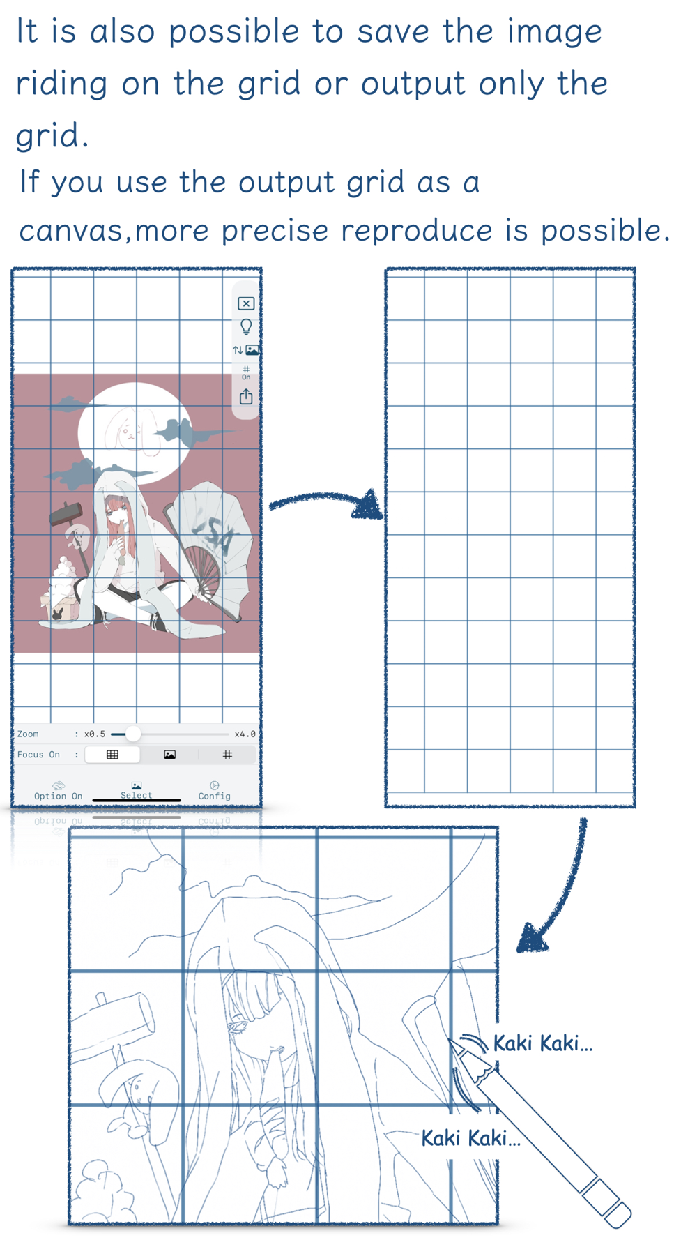 By placing a Grid-like auxiliary lines on the original image, you can make a Reproduce while always grasping the ratio of each part and the overall balance.