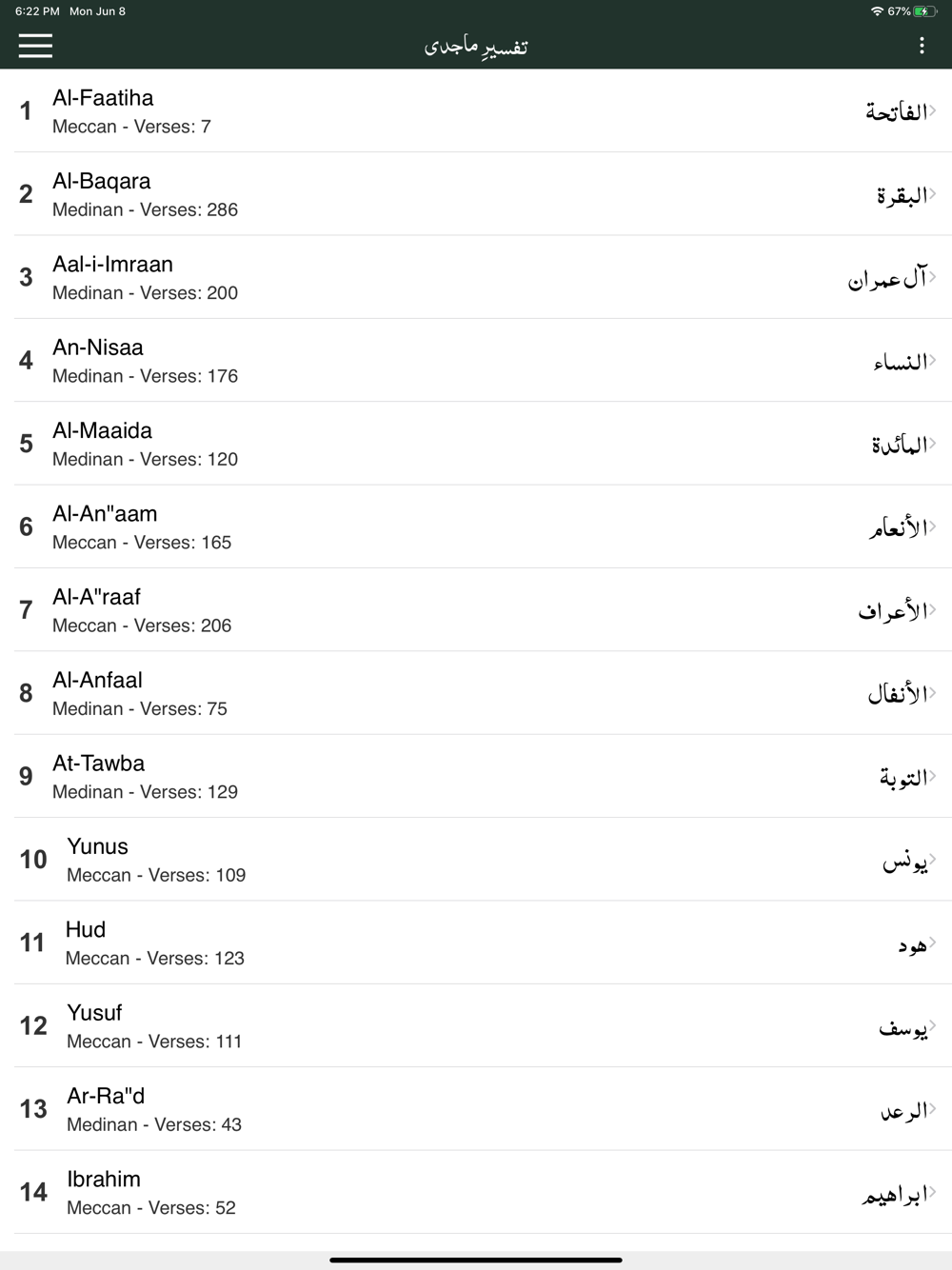 - Ability to show/hide Word by Word, Quran Translation (Tarjuma)