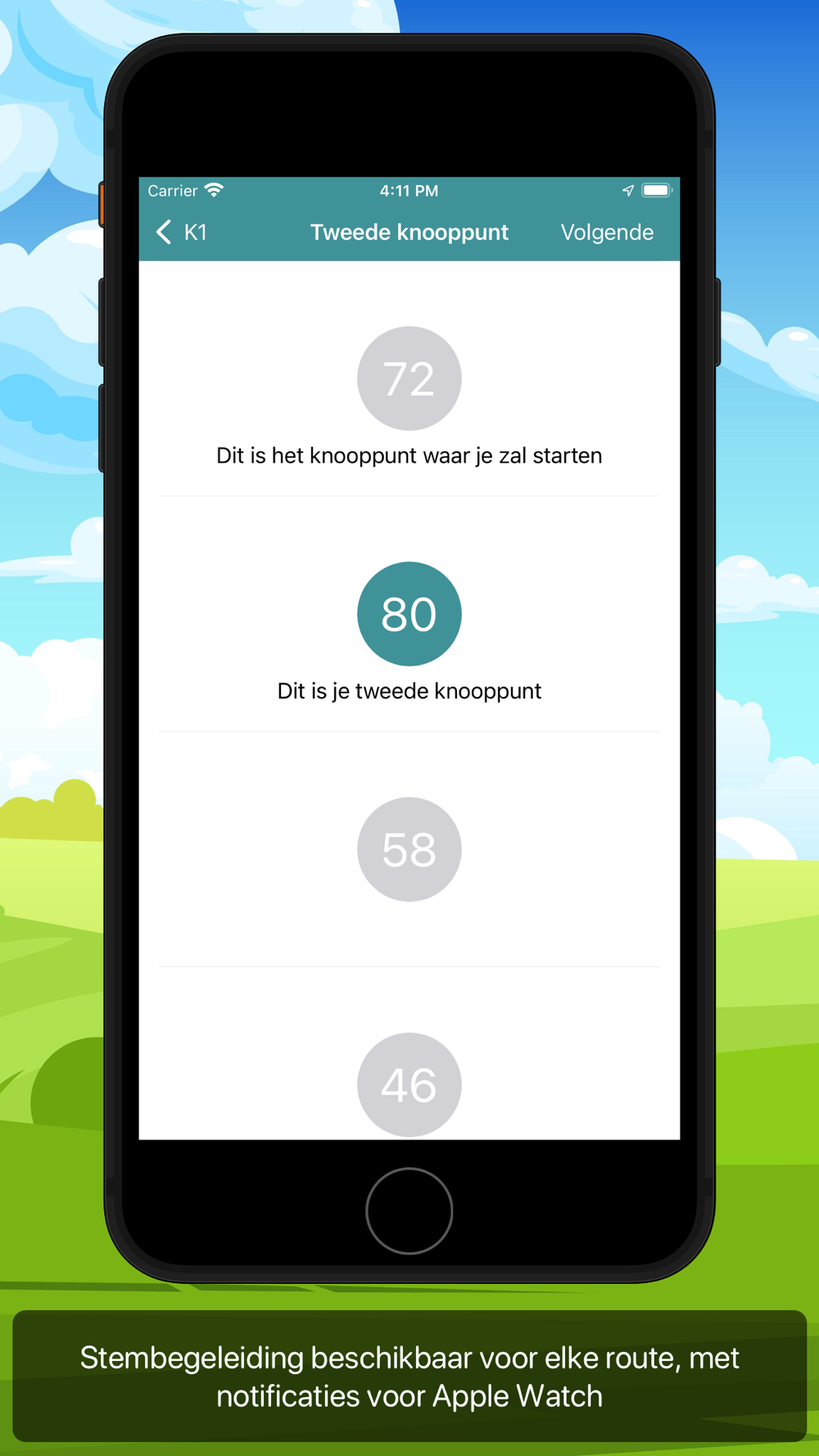 Stembegeleiding tijdens de activiteit laat je weten wanneer je een knooppunt nadert en laat je dit weten via gesproken stem en een notification die optioneel ook op je Watch wordt getoond. Kies het knooppunt waar je wil beginnen en geef je richting aan ... en de app doet de rest.
