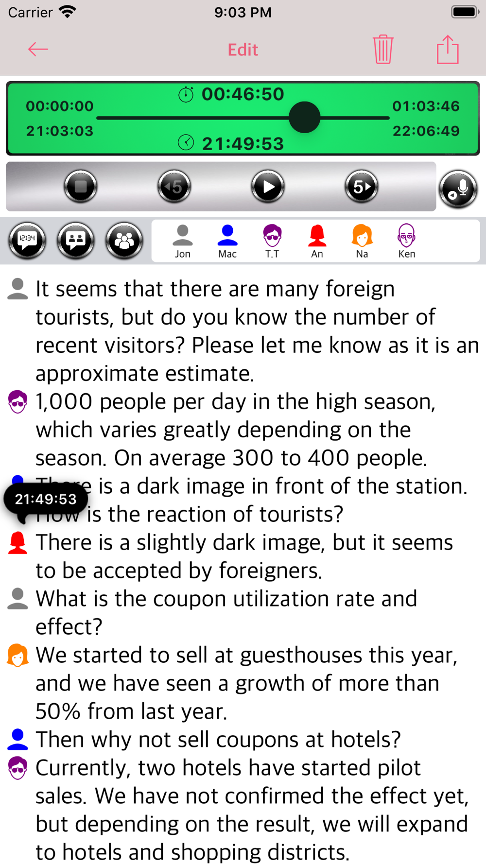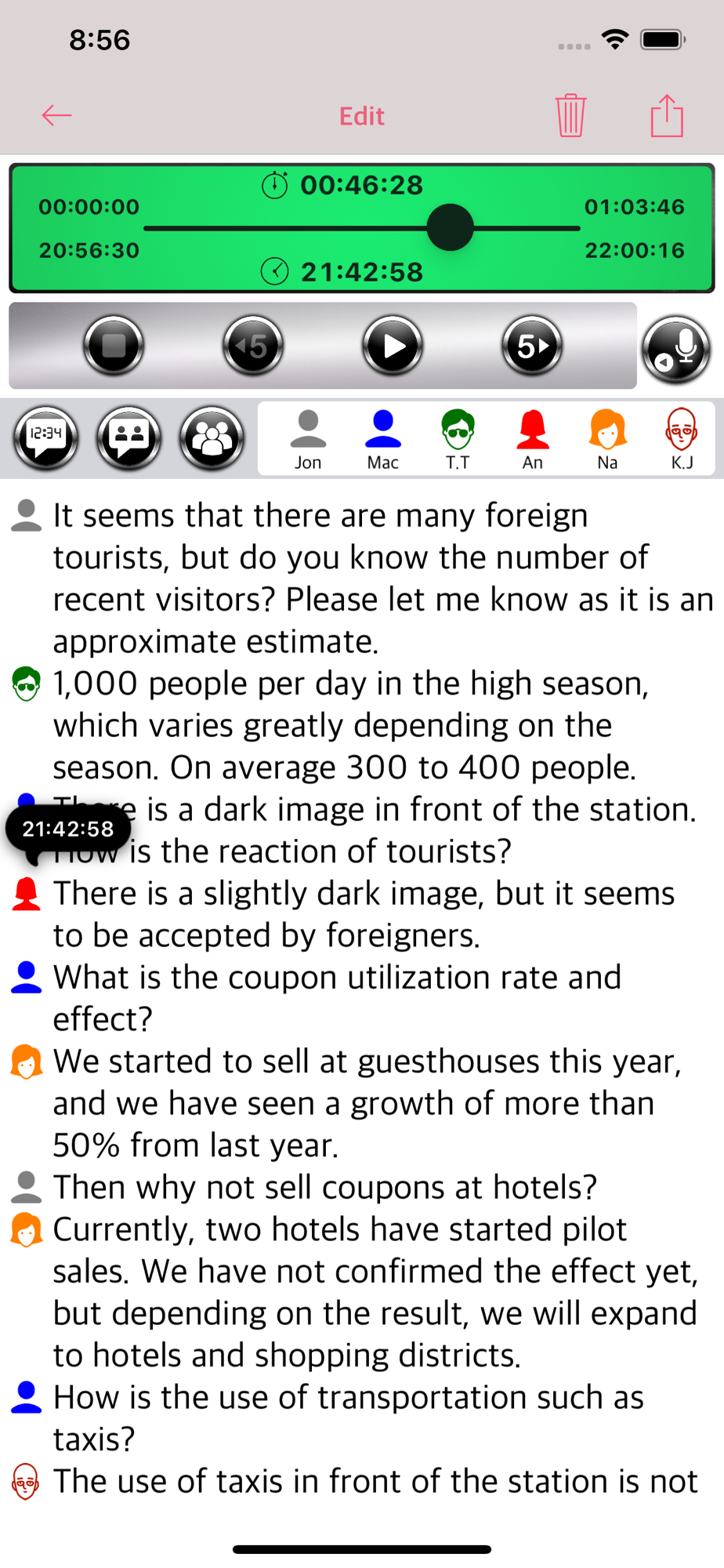 When playing back a recording, you can check the information (speaker, time) recorded in the note at the same time according to the audio time, reducing the workload for creating minutes.