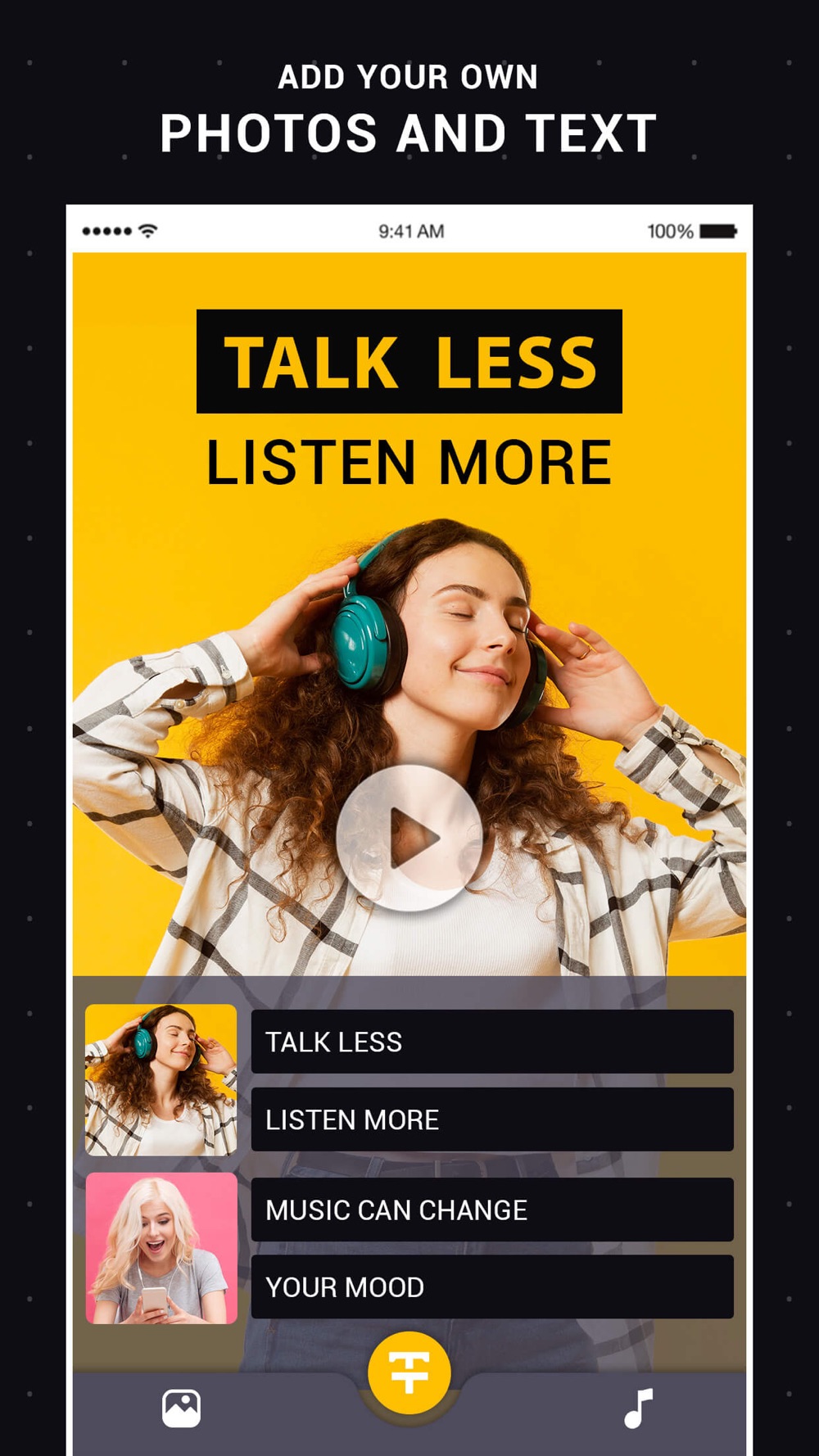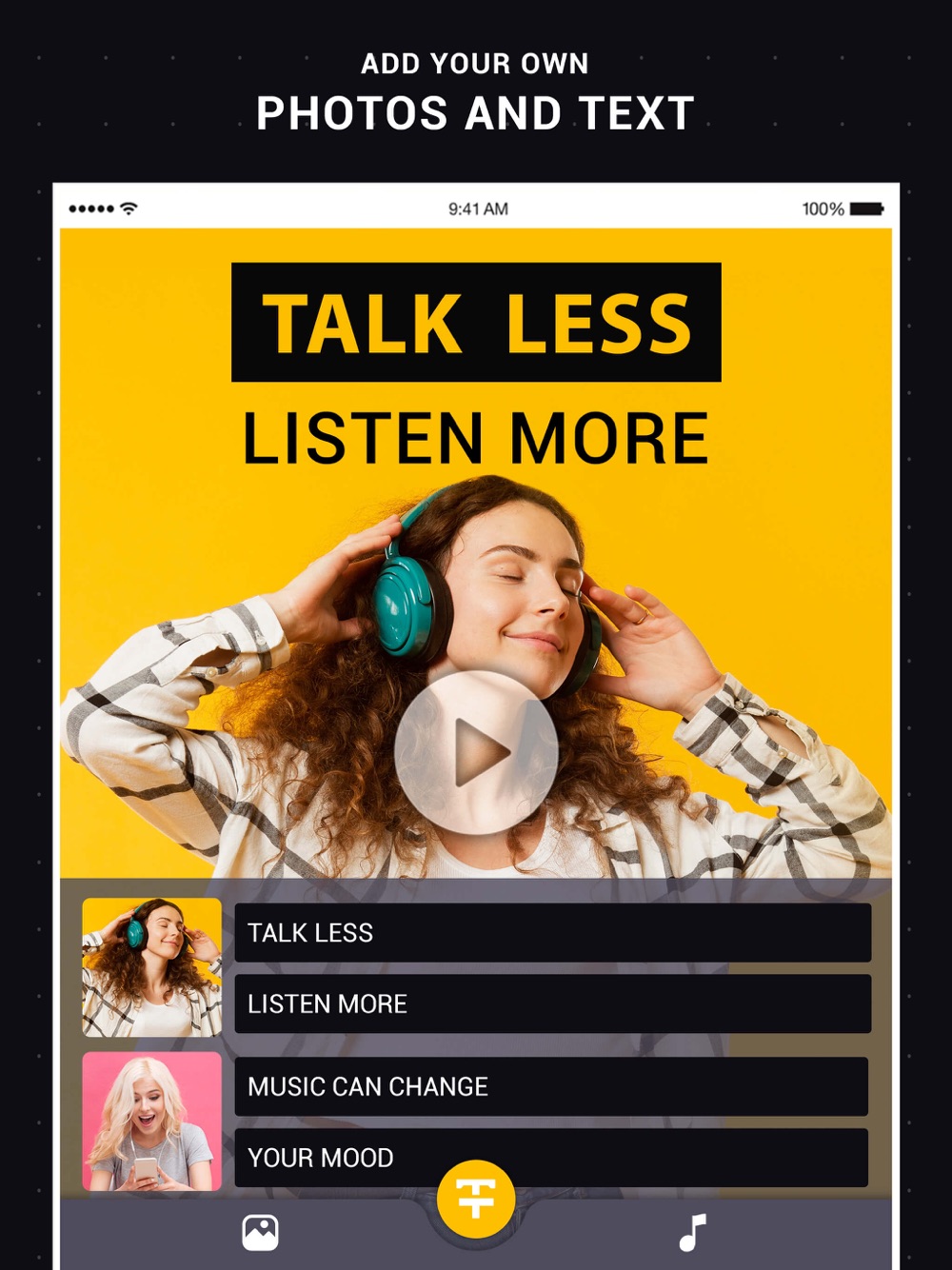 Choose from different types of music to set the mood, you can easily make fun, inspiring, or creative photo music videos, stories, and slideshows