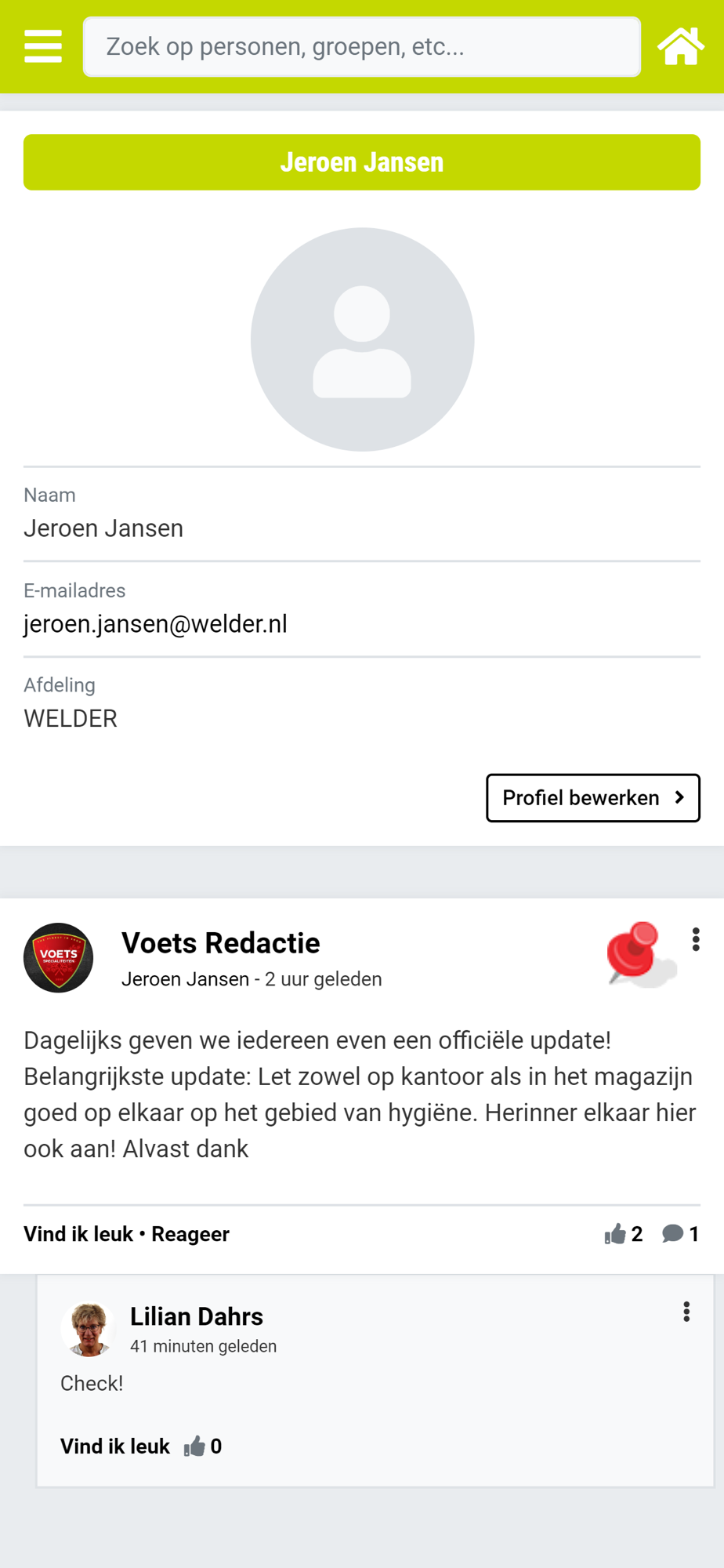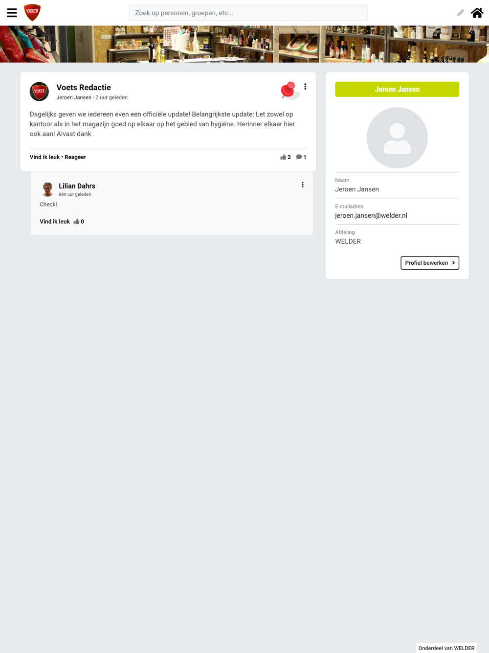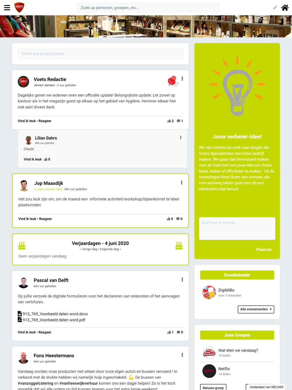 Voets-app; het sociale platform voor jou en jouw collega’s om heel eenvoudig en snel nieuwe kennis, ideeën en successen met elkaar te delen. Dankzij handige features als timelines, eventkalender, groepen, pushnotificaties en speciale community acties word jij realtime geïnformeerd over alles wat er bij jouw werkgever gebeurt. Zo blijf je betrokken bij de organisatie en verbonden met je collega’s kris kras door de organisatie! Samen bouw je aan een gezellige en stevige bedrijfscultuur.