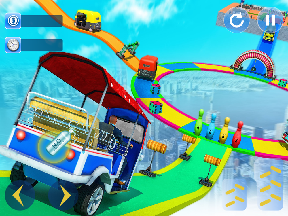 Spin auto rickshaw drive with highest speed of formula racing game. Revamping ultimate formula in tuk tuk stunts games - will enrage our sane stuntman to be master in mega ramp stunt games as best rickshaw wala. With 3-wheeler vehicles having turbo engine same as formula car, blends into a new ultimate rickshaw games 2020 with speed of super car. Be on racing tracks in trial of extreme racing stunts and bury the fear by performing car stunts in impossible tuk tuk drive.