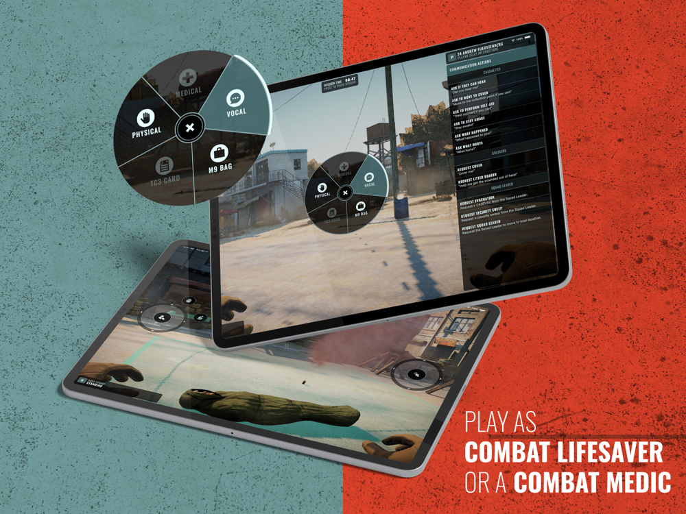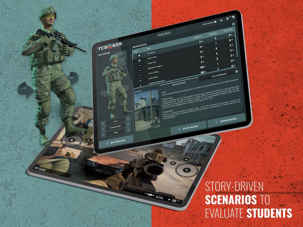 TC3Sim is a serious game which teaches and reinforces Tactical Combat Casualty Care training. It uses story-driven scenarios to evaluate a learner's knowledge of the tactics, techniques, and procedures essential for a Combat Medic (68W) or Combat Life Saver (CLS). You can play as U.S. Army, Navy, Marines, and Air Force personnel in various combat environments. You must complete key tasks to complete specific missions, including the ability to assess casualties, perform triage, and provide treatments to fellow soldiers.