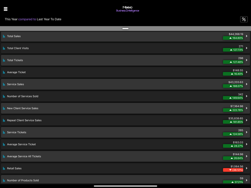 • View your most critical performance indicators: Total Sales, Average Ticket, New Client Service Sales, Total Tickets, and many more.