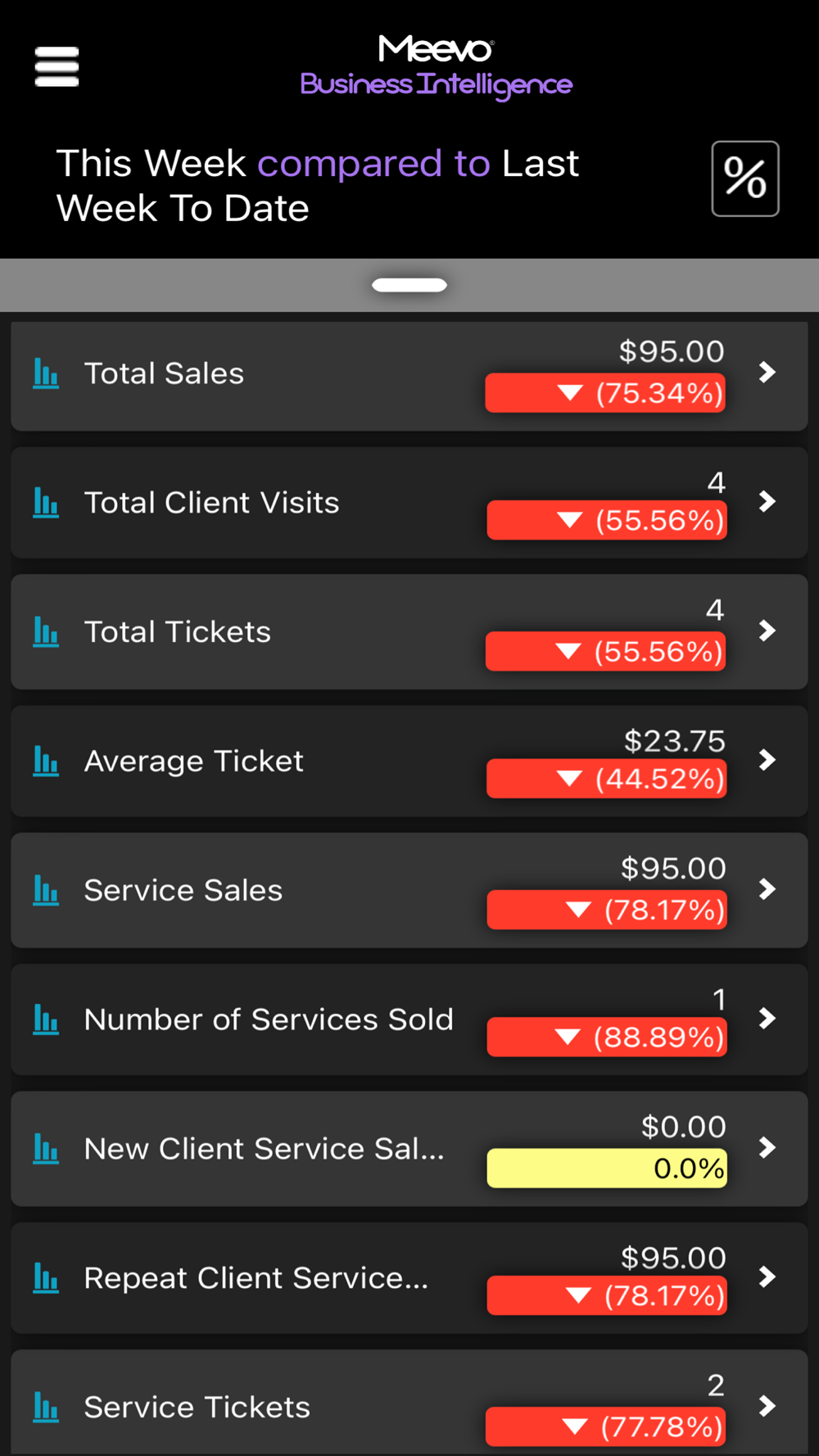Access your key performance data and metrics anytime, anywhere with Meevo Business Intelligence (BI). View real-time data, compare by different date ranges, and drill down to the employee level to see how your staff is performing. Do you manage a multi-location business? Easily view data from all your locations or sort by individual locations for a complete, detailed view of your business.