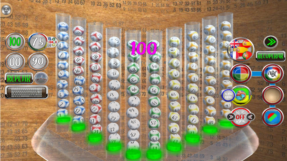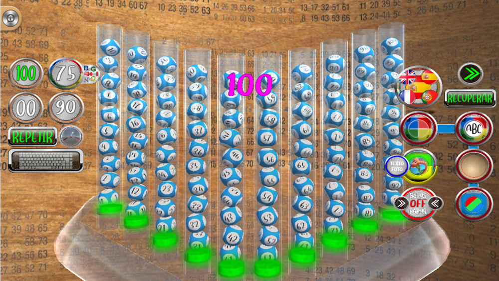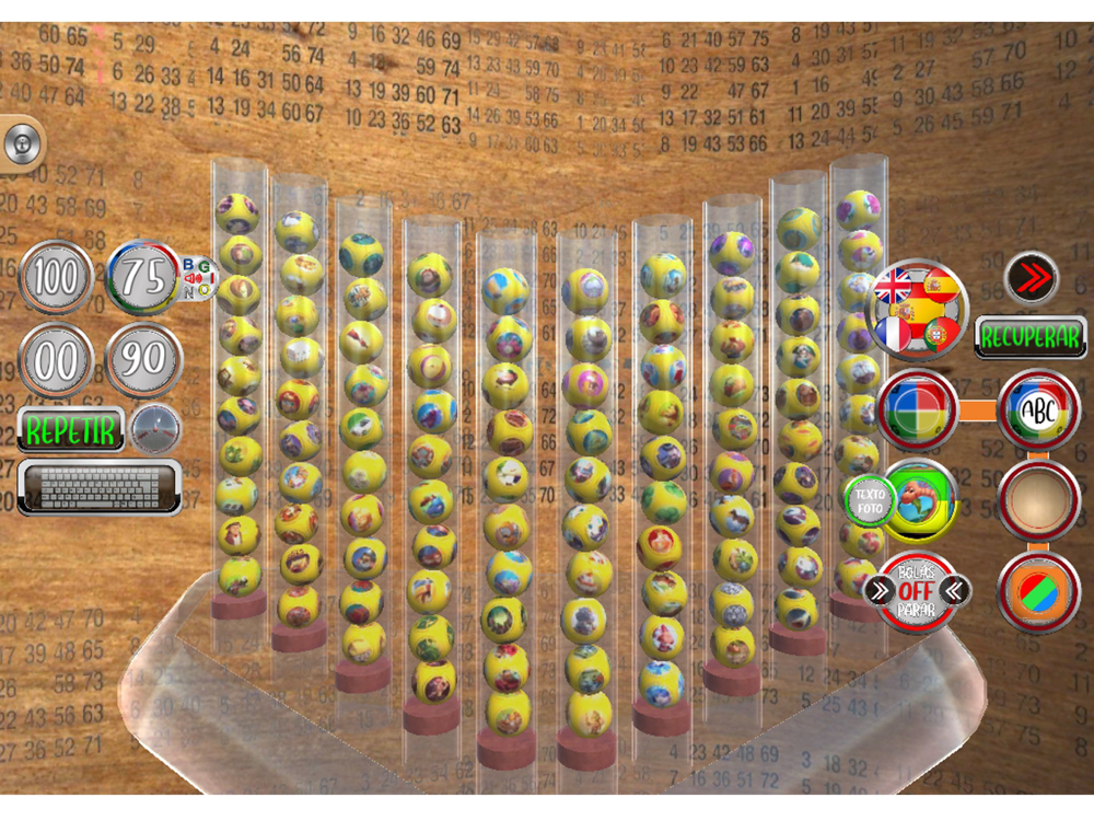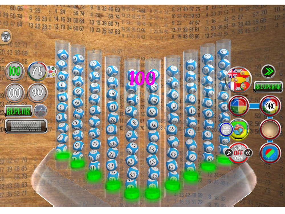- Simula el bombo del bingo en 3D , pero sin cartones , 75 y 100 bolas .