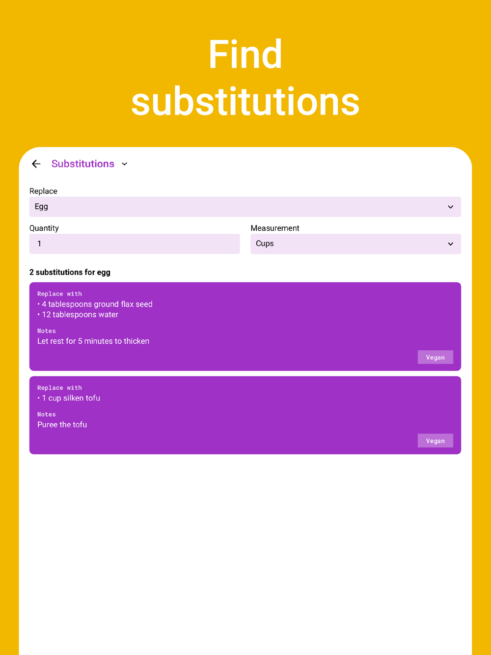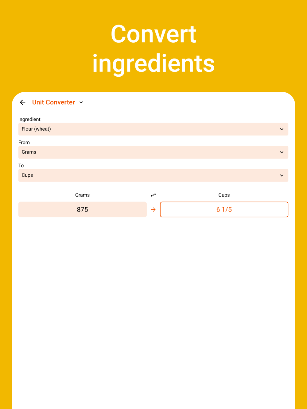 Select an ingredient and convert between units. E.g. sticks of butter in grams, ounces to tablespoons, etc.