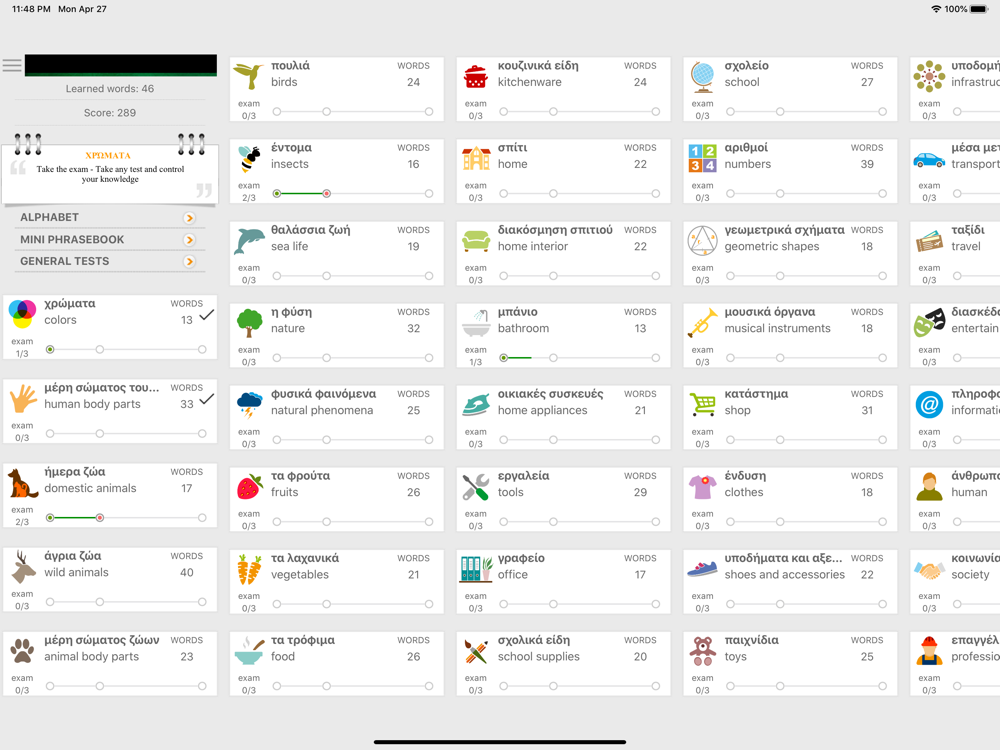 - Testing of the knowledge of the words happens through fun and simple tests: