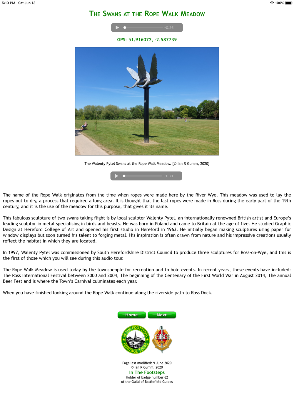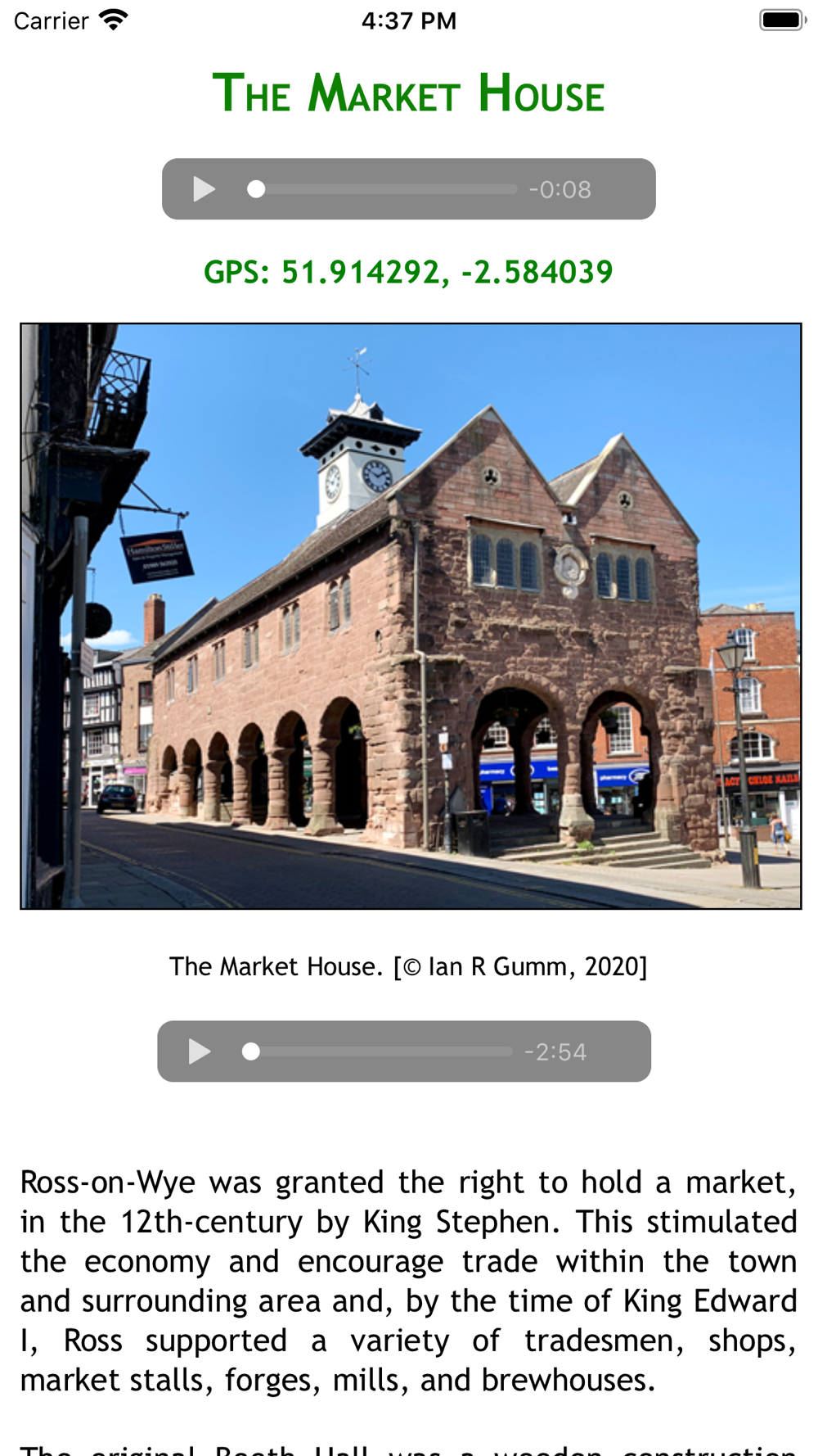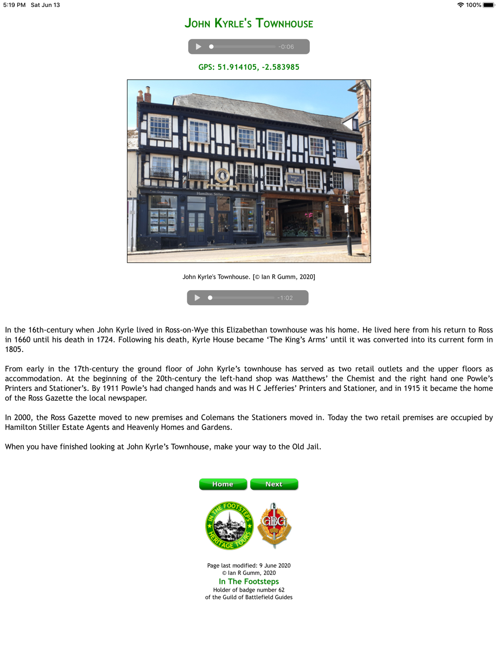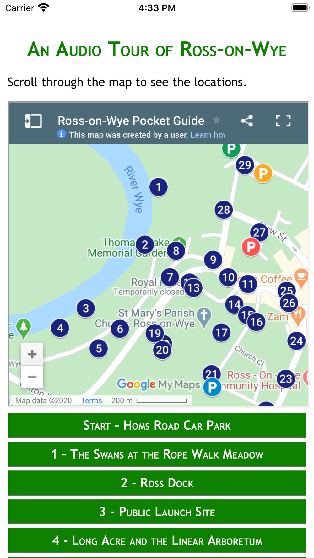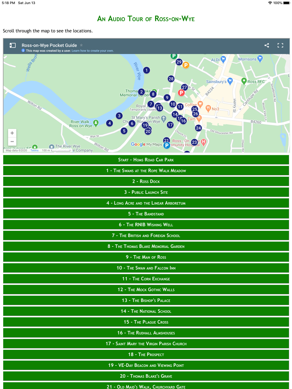 This app is a self-guided audio tour is designed to guide people around the lovely Herefordshire market town of Ross-on-Wye. It begins and ends at Homs Road Car Park, which is located at the northern end of the town centre next to the Ross-on-Wye and Monmouth Sea Cadet Centre.
