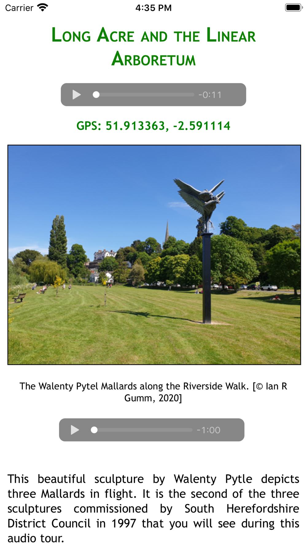 For each location, there is an audio presentation. This is located directly below the photograph of the location at the top of the page. Press play on the audio playback bar to listen to the presentation. A transcript of the audio presentation is shown below the audio bar for your reference.