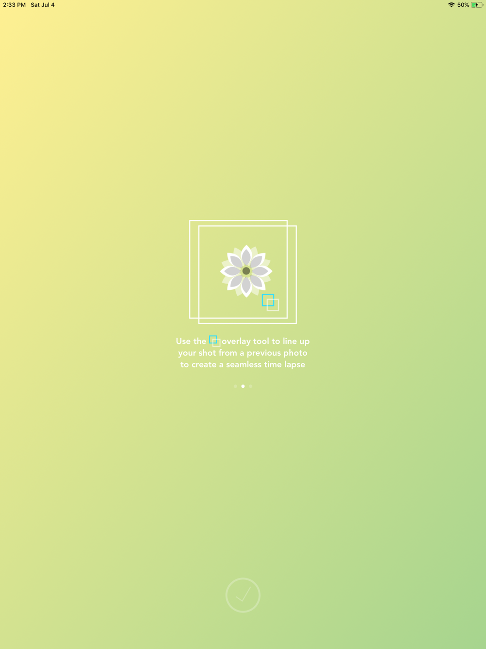 • Show/Hide an overlay of your last photo so that each new photo lines up precisely with the last one you took