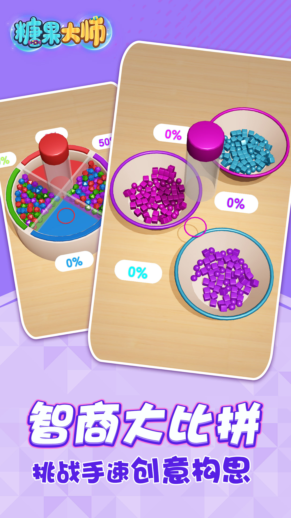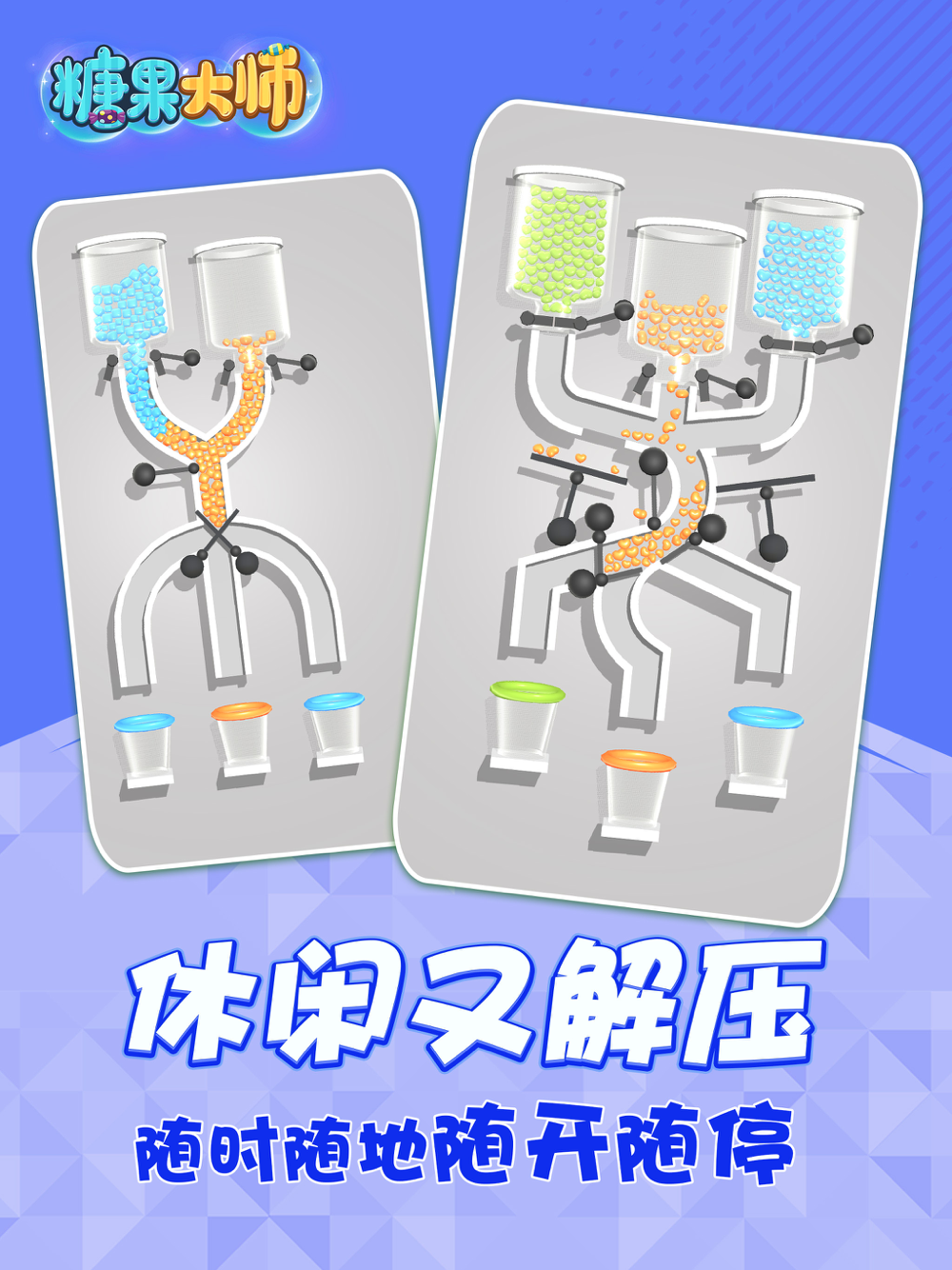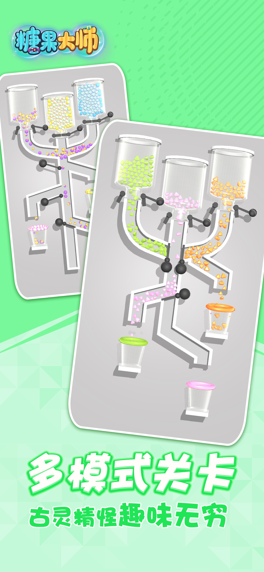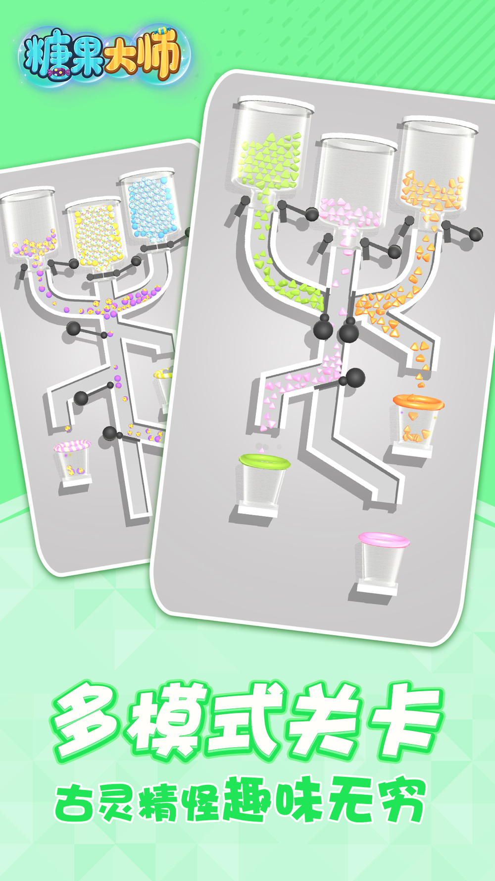 糖果大师是一款画风简洁的超休闲手游,在游戏中,玩家们通过移动指针控制糖果的下滑路径,让糖果正确的投入到瓶子中,操作很简单又具有一定的可玩性。