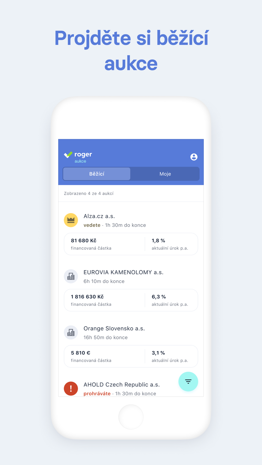 Prostřednictvím Roger Aukce investujte do faktur za bonitními společnostmi s průměrným úrokem 4,8 % p.a. K registraci potřebujete pouze dva doklady totožnosti a smlouvu o vedení účtu, případně výpis z bankovnictví. Po registraci vidíte přehled všech aukcí a faktur, kterých se můžete zúčastnit formou bidování úroků. Teď už jen stačí vybrat investici podle vašich preferencí a mít ji všude s sebou.