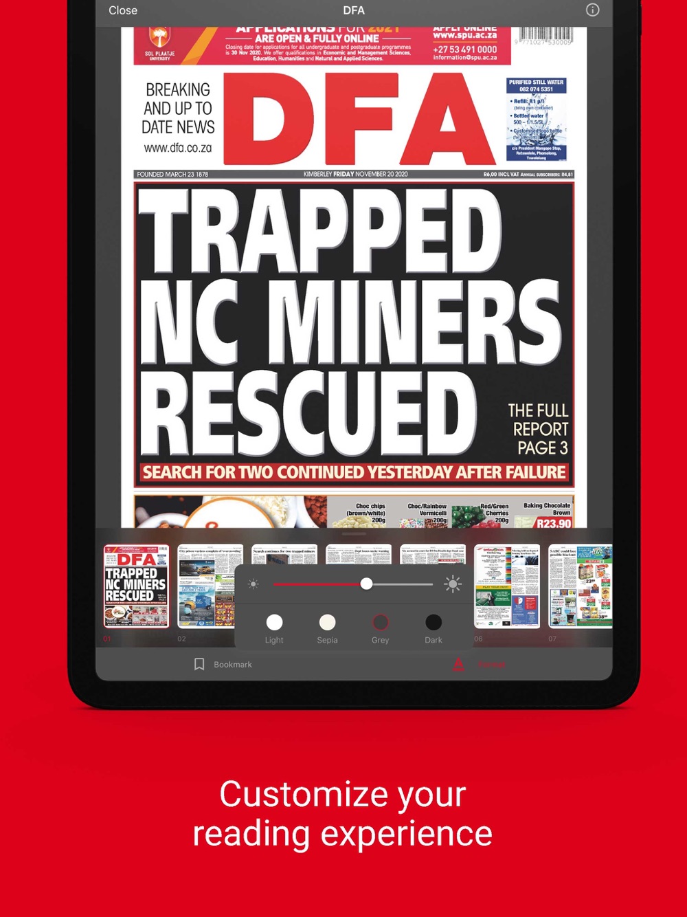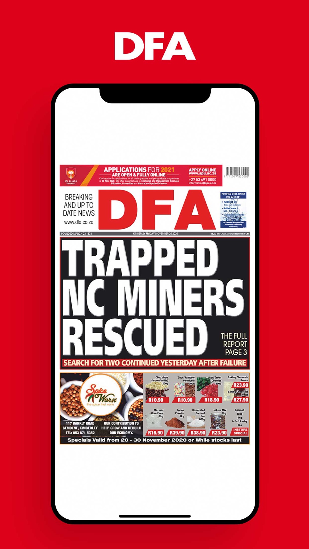 Launched in 1878, the Diamond Fields Advertiser is the oldest newspaper in the Northern Cape. It is recognised as the independent voice of the Northern Cape; informing, empowering and championing the cause of the province and its people, every day without fear, favour or prejudice in accordance with the highest journalistic standards in the country.