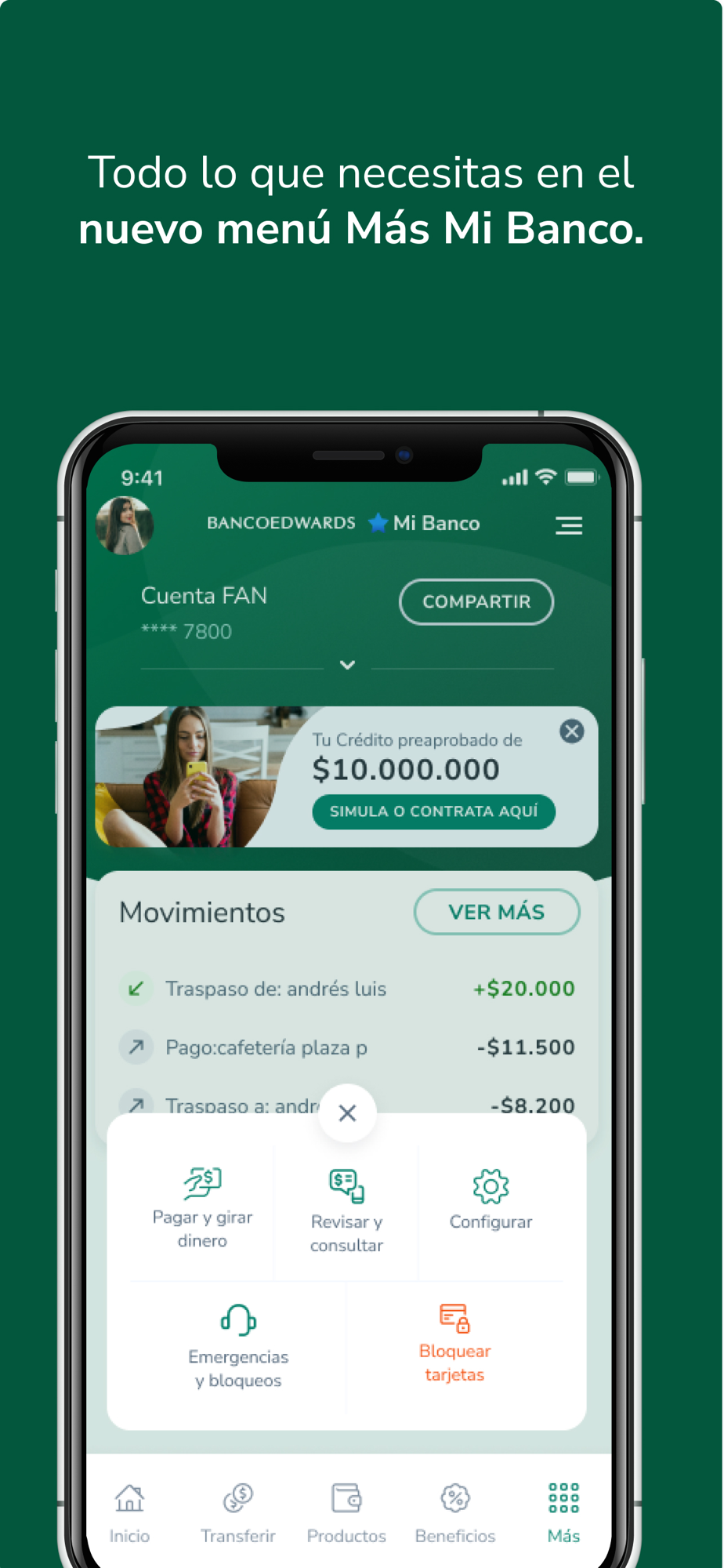 Consulta el saldo y últimos movimientos de tus cuentas y tarjetas de crédito, transfiere a terceros, paga tus tarjetas y el monto utilizado en tu línea de crédito. Ademas, podras pagar tus cuentas de servicio