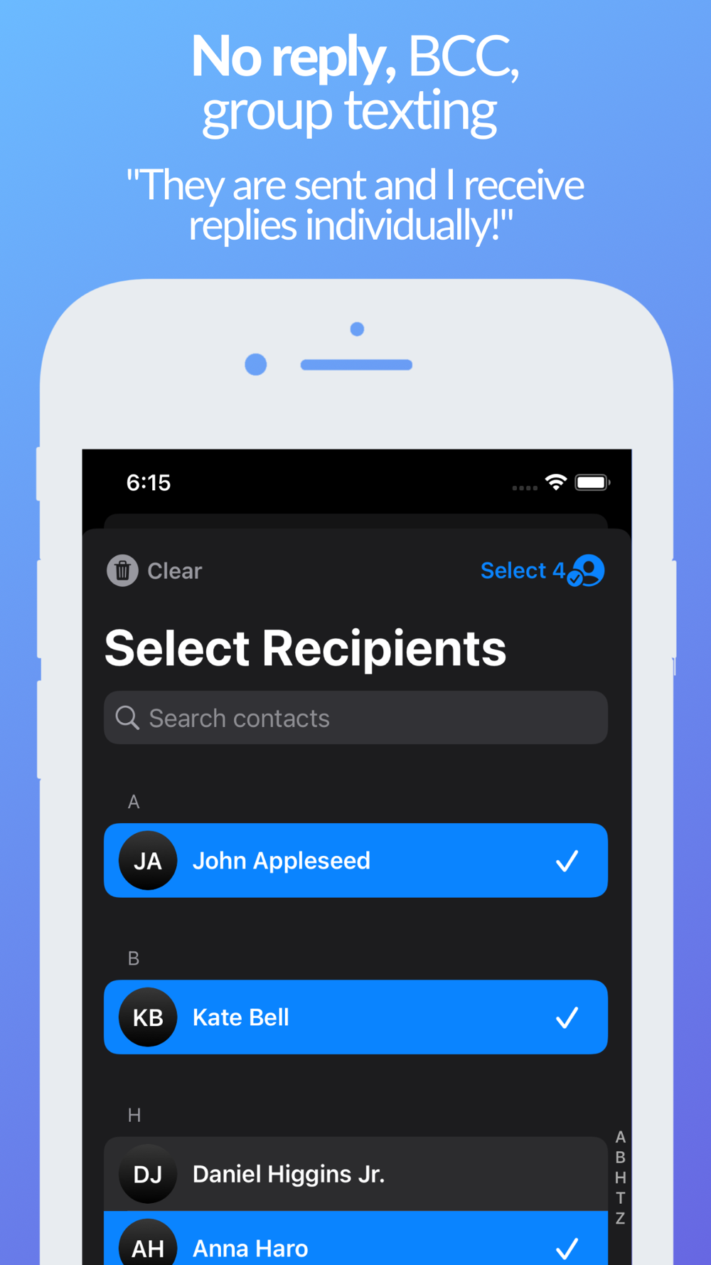 - No reply, BCC group texting, so only your recipient will see who got your text, just like BCC email. Replies will come to only you!