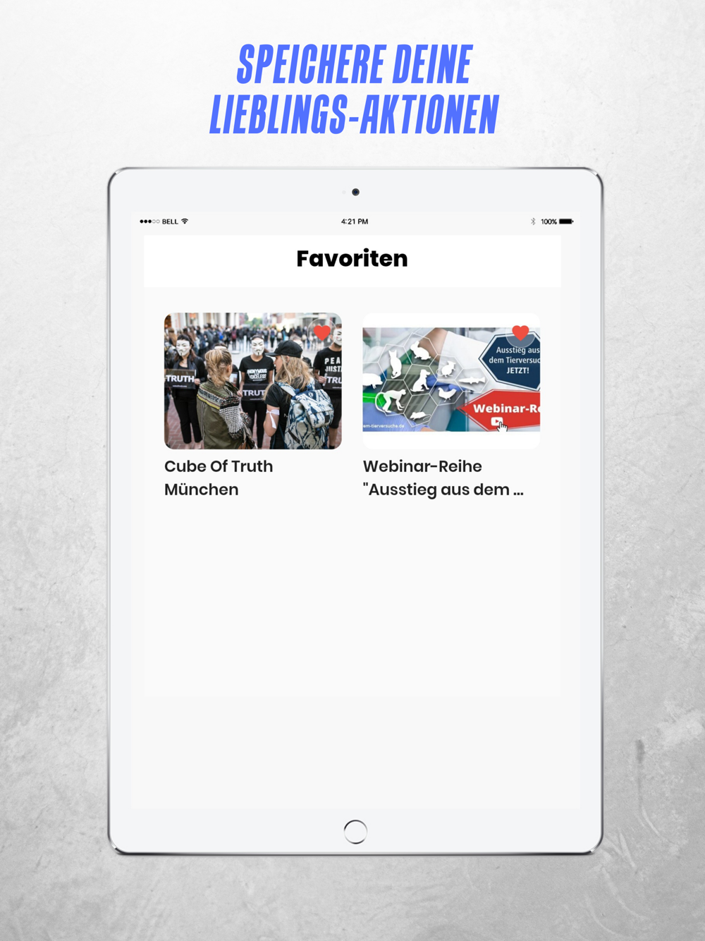 Auf der Startseite findest du eine Übersicht von populären Events, kommenden Großveranstaltungen sowie Aktionen, die sehr bald stattfinden. Auf der Kategorie-Seite findest du eine Liste von allen in Deutschland aktiven Tierrechtsorganisationen und kannst durch antippen all deren kommende Veranstaltungen ansehen. Außerdem gibt es einen Filter für Online- und Offlineaktionen.