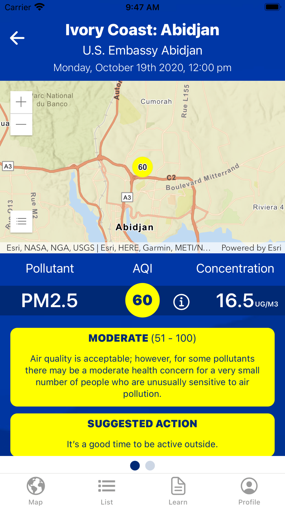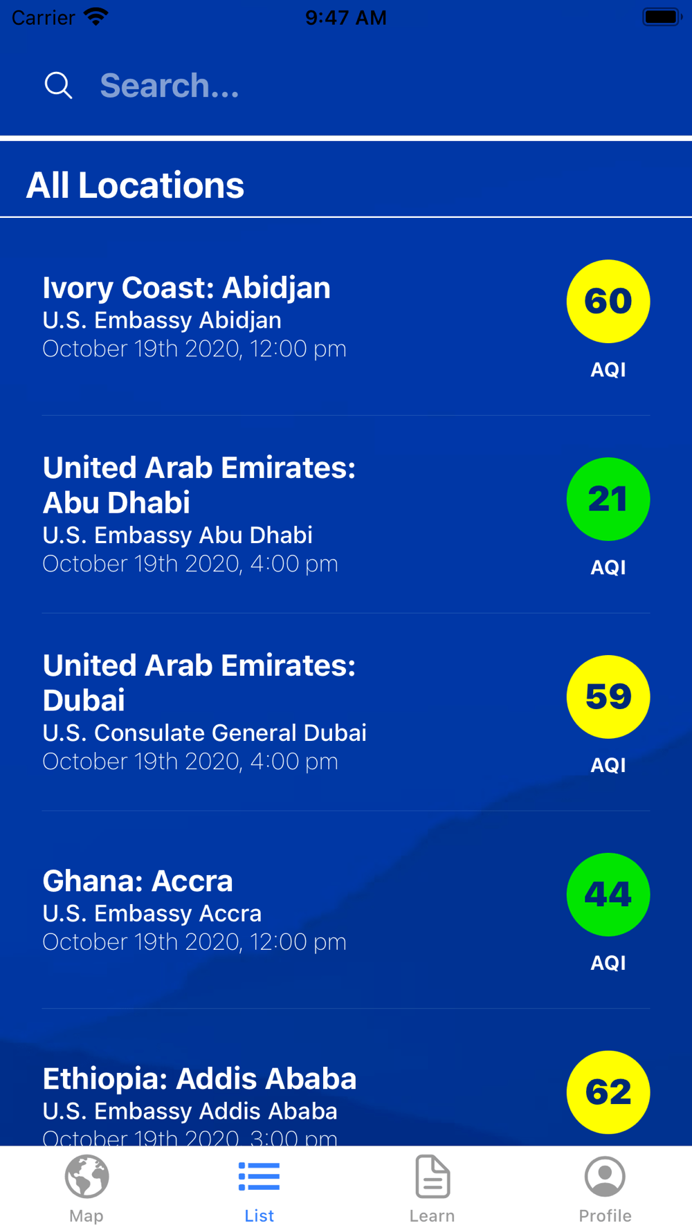 Reliable, trustworthy, real-time air quality data. ZephAir gives you reference-grade air quality information from more than 70 locations around the world. The data is collected by the U.S. Department of State and other government partners. ZephAir features non-U.S. locations and Washington, D.C. only. App features include: