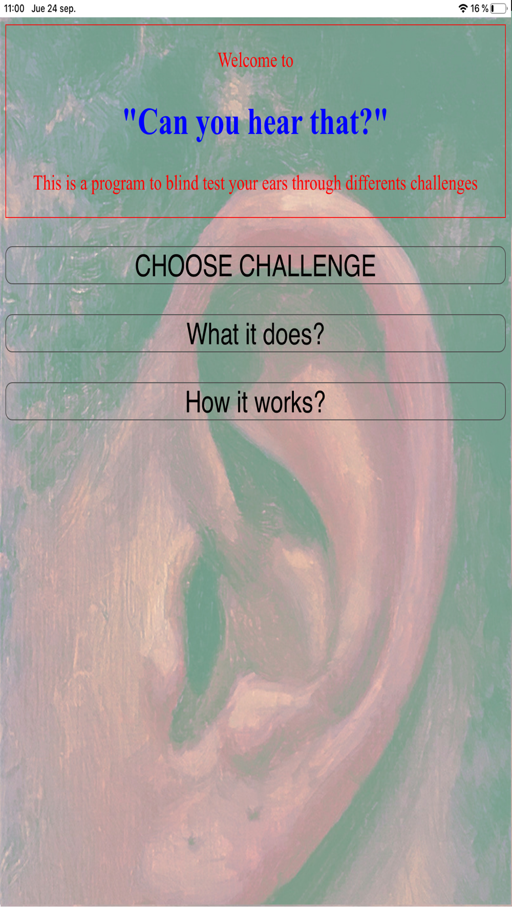 An app that allows the user to play hearing challenges to test their hearing. Useful for audio enthusiasts, sound engineers and audiophiles, wanting to know accurately, if they are able to hear subtle differences in audio material. This is a first on their kind app.....Hey Audio engineer! Test the ears of your colleages and your own with this app. Have fun to see who can recognize different frequencies and audio formats. The internal programmng of the app is a very serious algorithm who can`t be fooled. This app WILL TELL YOU if the user really can or can`t hear different challenges.
