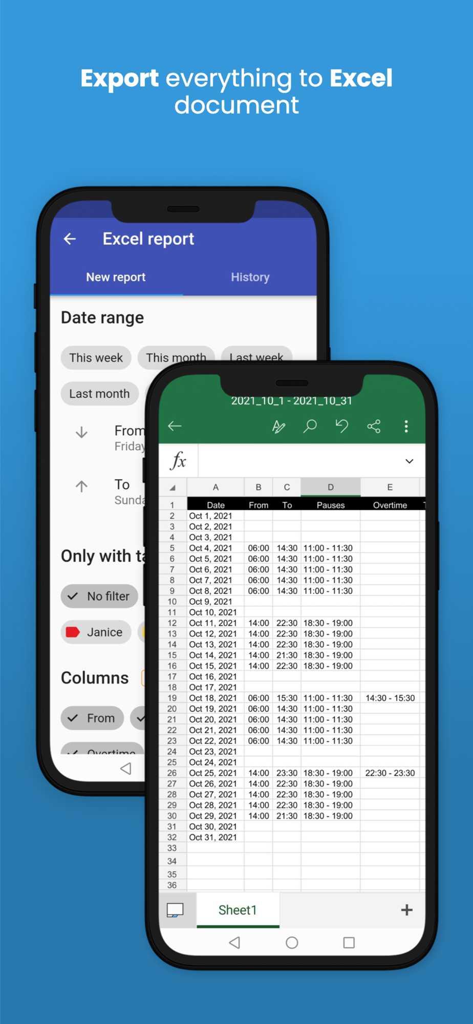 At the end of a workday, Time sheet Time Tracker automatically detects if you worked overtime and calculates accurate estimates. Add your custom statistics for a more detailed overview of how you spend your time. Timesheet has been designed with an intuitive interface - it's easy to use and beautifully designed.