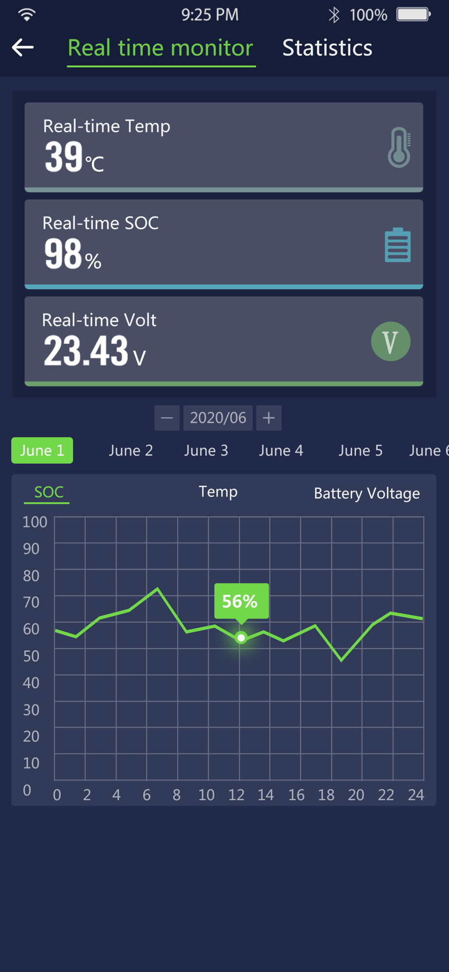 Battery temperature, volt, charge can be reviewed in real-time. In the statistic table, user can check battery SOH, temperature, SOC, CCA, Internal resistance, Ah, volt which is tested by app automatically or manually.