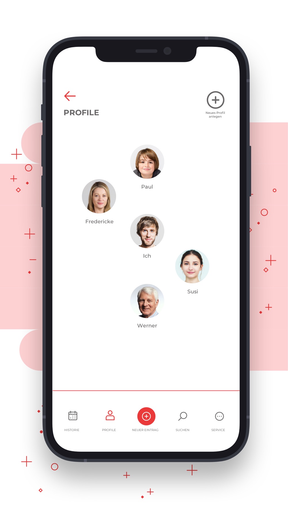 Lege ein Profil für dich und deine Familie, Kinder, Eltern, Großeltern oder dein Haustier an und verwalte deine Krankengeschichte selbst. Alles kostenlos und ohne Registrierung. Deine Daten werden nur auf deinem Smartphone gespeichert!