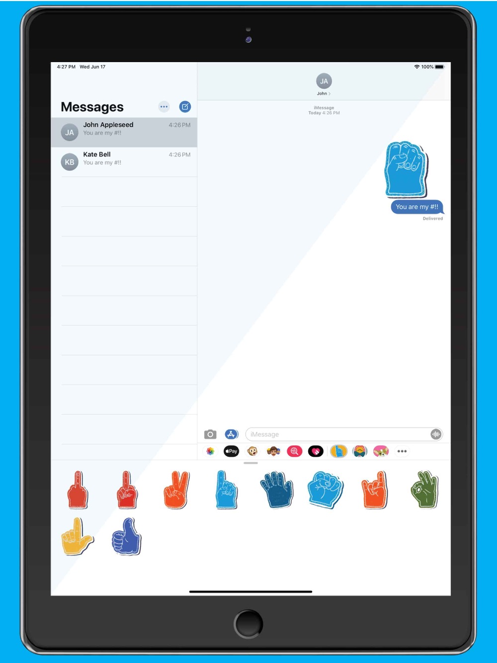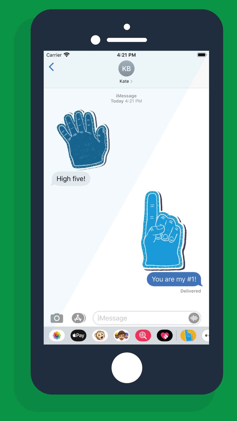 Download today! Start sharing this 10 pack of animated hand-drawn, foam hands style. This iMessage stickers pack is great to express yourself during your favorite sporting event. Share with family and friends. Let our "Foam Hands" stickers brighten up your chat messages every day! Send to any sport fan in your life.