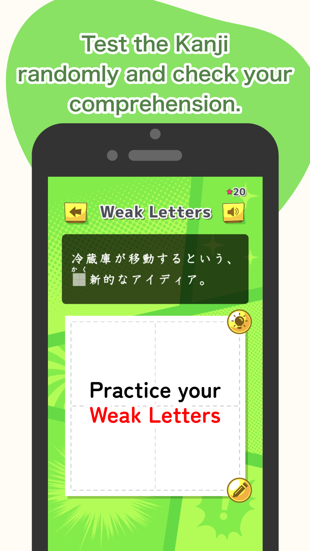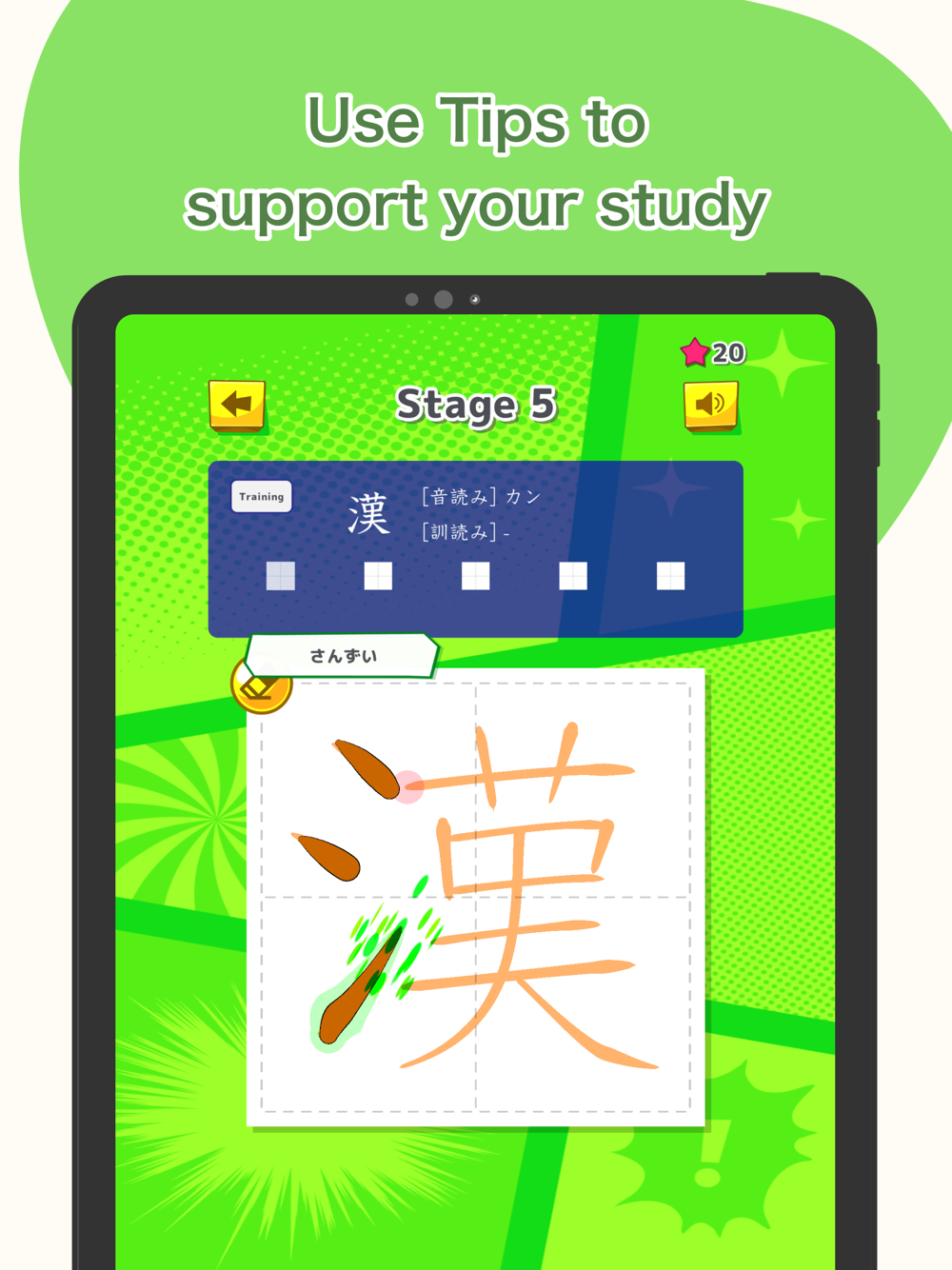 Free Kanji Learning app for elementary school learners. All the letters to learn in 1st to 6th grade is covered for free. Funny illustrations will show up to help you remember the impression of each kanji letters. The app focuses on how to learn writing kanji. We know that just tracing the correct letter won't help you remember the shape of kanji. For effective learning, each hint will give you the shape of next stroke one by one in correct order. It also let you to write each stroke with dynamic pen width, which enables you to write beautiful letters.