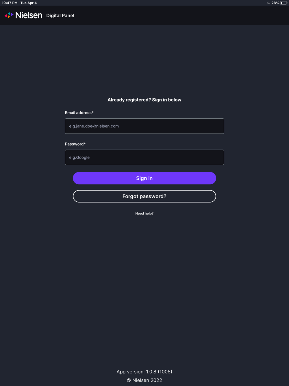 Before downloading our Nielsen Mobile App you must first sign up using our registration form, which can be found at https://digitalpanel.nielsen.com. Once submitted, please download this application to your smartphone or tablet. (If you have not completed our registration form, this app will not function and you will not receive rewards).